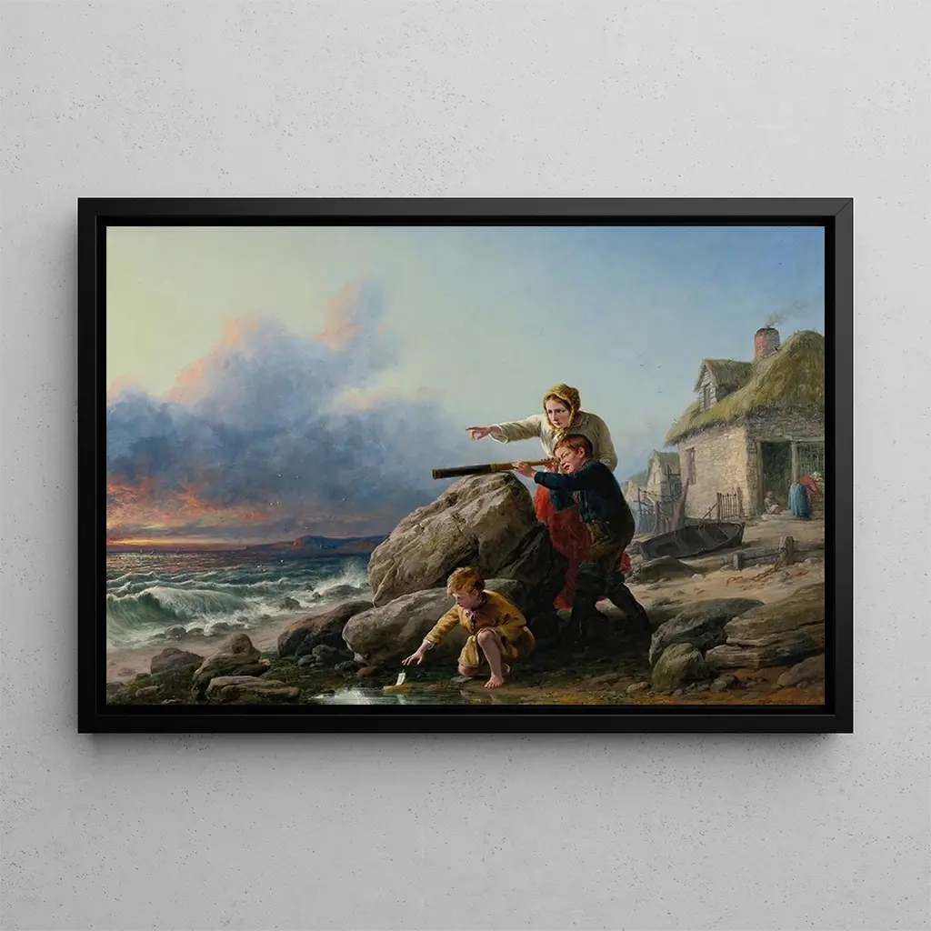 Druk artystyczny À l'Affût des Bateaux autorstwa Williama Bromleya przenosi nas w fascynującą scenę morska, gdzie białe żagle łodzi wyróżniają się na tle niebieskiego nieba. Drobne szczegóły i żywe kolory sprawiają, że to dzieło jest pełne życia, niemal namacalne. Refleksy na wodzie i ruch fal dodają kompozycji dynamizmu, zachęcając widza do odczuwania morskiej bryzy. Ta płótno nie tylko ukazuje piękno żeglarstwa, ale także harmonię między człowiekiem a naturą, uchwycając moment spokoju nad brzegiem wody.