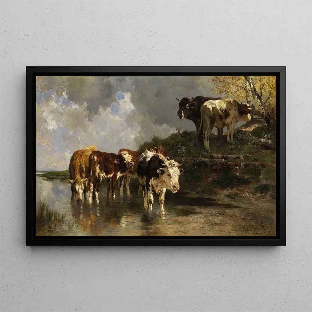 W tej reprodukcji Bétail à l'abreuvoir, Anton Braith przenosi nas w serce spokojnej i wiejskiej atmosfery. Delikatne i naturalne odcienie, od jaskrawych zieleni po ciepłe brązy, wywołują doskonałą harmonię między zwierzętami a ich otoczeniem. Technika artysty, która zręcznie łączy realizm z nutą impresjonizmu, pozwala odczuć świeżość wody i spokój krajobrazu. Każdy szczegół, od odbić na powierzchni wody po cienie drzew, przyczynia się do stworzenia żywej i immersyjnej sceny, zachęcając widza do zatrzymania się i kontemplacji tego prostego, lecz cennego momentu życia.