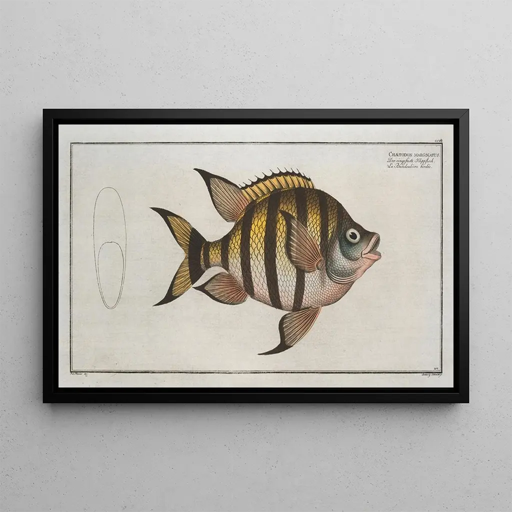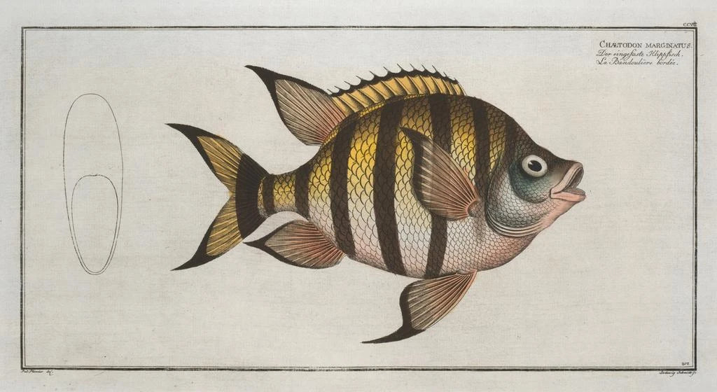 Marcus Elieser Bloch, naturaliste et artiste du XVIIIe siècle, est célèbre pour ses contributions à l'ichtyologie, l'étude des poissons. Son œuvre "Ichthyologie" est un jalon dans la représentation scientifique des espèces aquatiques. Bloch a voyagé à travers l'Europe et au-delà, s'inspirant de la faune marine qu'il rencontrait. Son approche allie rigueur scientifique et esthétique, faisant de lui un pionnier dans le domaine de l'art naturaliste. Ses illustrations, telles que celle du "Chaetodon marginatus", continuent d'influencer les artistes et les scientifiques aujourd'hui.
