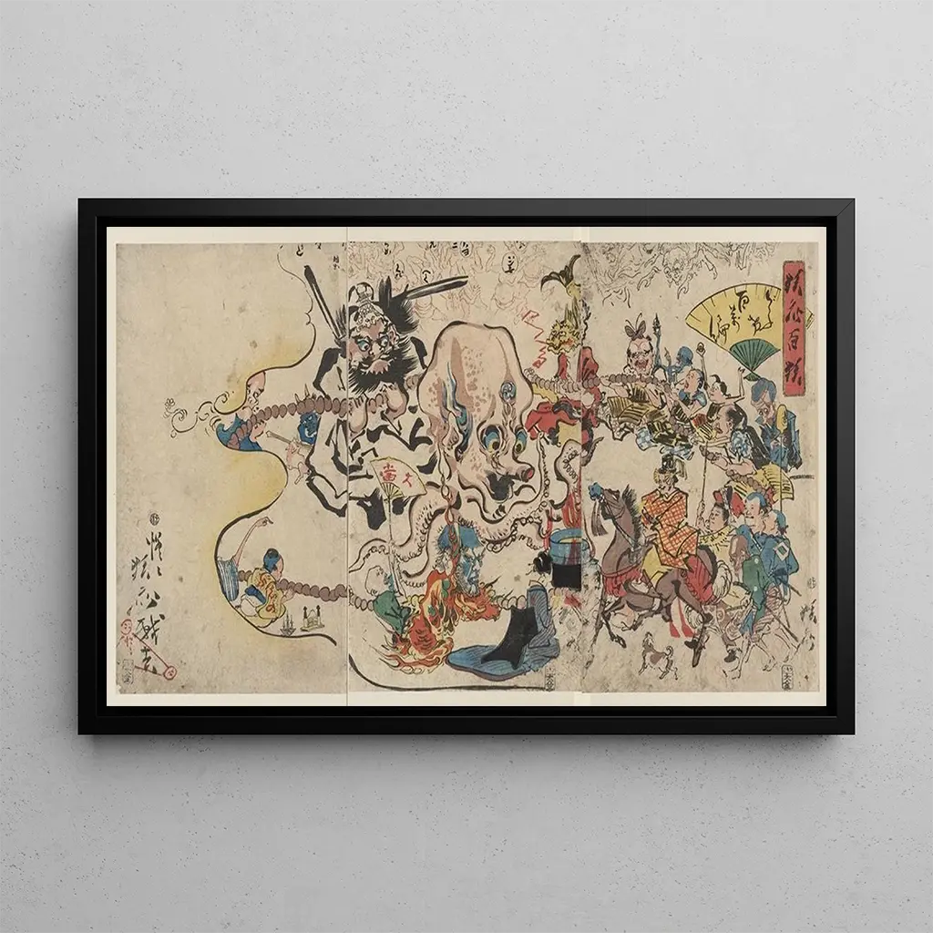 Kawanabe Kyōsai, aktywny w drugiej połowie XIX wieku, jest jednym z ostatnich wielkich mistrzów ukiyo-e, stylu japońskiego drzeworytu, który osiągnął szczyt popularności w epoce Edo. Pod wpływem artystycznych tradycji swojego czasu, potrafił zintegrować elementy kultury zachodniej, zachowując jednocześnie esencję japońskiej sztuki. Jego kariera była naznaczona dążeniem do eksperymentowania i innowacji, co pozwoliło mu wyróżnić się w środowisku artystycznym w pełnej przemianie. Jego dzieła, takie jak Druk artystyczny Dke Hyakumanben, świadczą o jego umiejętności uchwycenia życia we wszystkich jego formach, czyniąc go nieodłączną postacią w historii japońskiej sztuki.