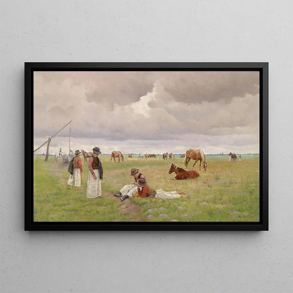 Jeunes bergers dans la Puszta : une scène bucolique empreinte de sérénité Dans cette reproduction de l'œuvre "Jeunes bergers dans la Puszta", Hermann Reisz nous transporte au cœur des vastes plaines hongroises. La toile dépeint deux jeunes bergers, entourés d'une nature luxuriante, où les couleurs douces et chaudes se mêlent harmonieusement. Les nuances de vert, de jaune et de brun créent une atmosphère paisible, presque rêveuse, invitant à la contemplation. La technique de Reisz, qui allie réalisme et impressionnisme, permet de ressentir la lumière du soleil filtrant à travers les arbres, ajoutant une dimension vivante à cette scène idyllique. Hermann Reisz : un témoin de la vie rurale au XIXe siècle Hermann Reisz, peintre d'origine hongroise, est reconnu pour ses représentations de la vie rurale et des paysages de la Puszta. Actif au XIXe siècle, il a su capturer l'essence de la nature et des traditions de son pays. Influencé par le mouvement romantique, Reisz a développé un style qui met en avant la beauté des scènes quotidiennes, loin des tumultes urbains. Ses œuvres, souvent empreintes de nostalgie, témoignent d'une époque où la nature était au cœur de la vie des gens, faisant de lui un artiste important pour comprendre l'évolution de l'art paysager en Europe. Une acquisition décorative aux multiples atouts La reproduction de "Jeunes bergers dans la Puszta" est une pièce décorative qui saura embellir votre intérieur, que ce soit dans un salon, un bureau ou une chambre. Sa qualité d'impression et sa fidélité aux couleurs originales en font un choix idéal pour ceux qui apprécient l'art authentique. Ce tableau apporte une touche de sérénité et de nature à votre espace, tout en suscitant l'admiration de vos invités. En intégrant cette toile dans votre décoration, vous créez une ambiance chaleureuse et accueillante, tout en célébrant le talent d'Hermann Reisz.