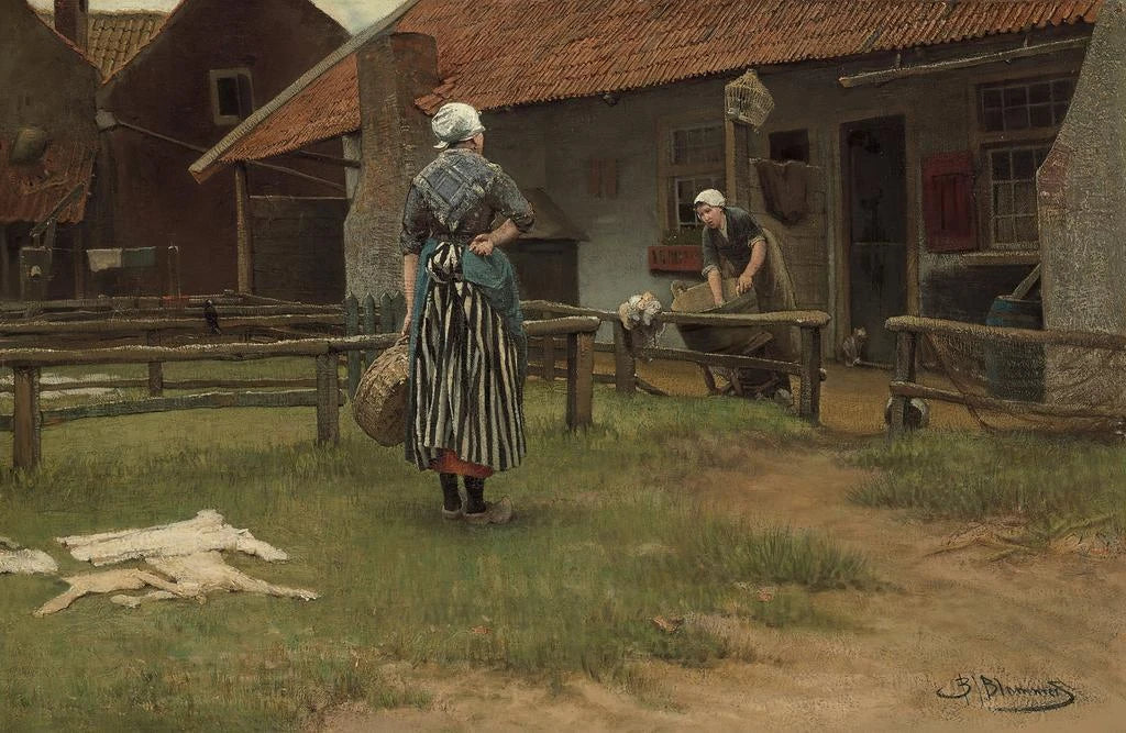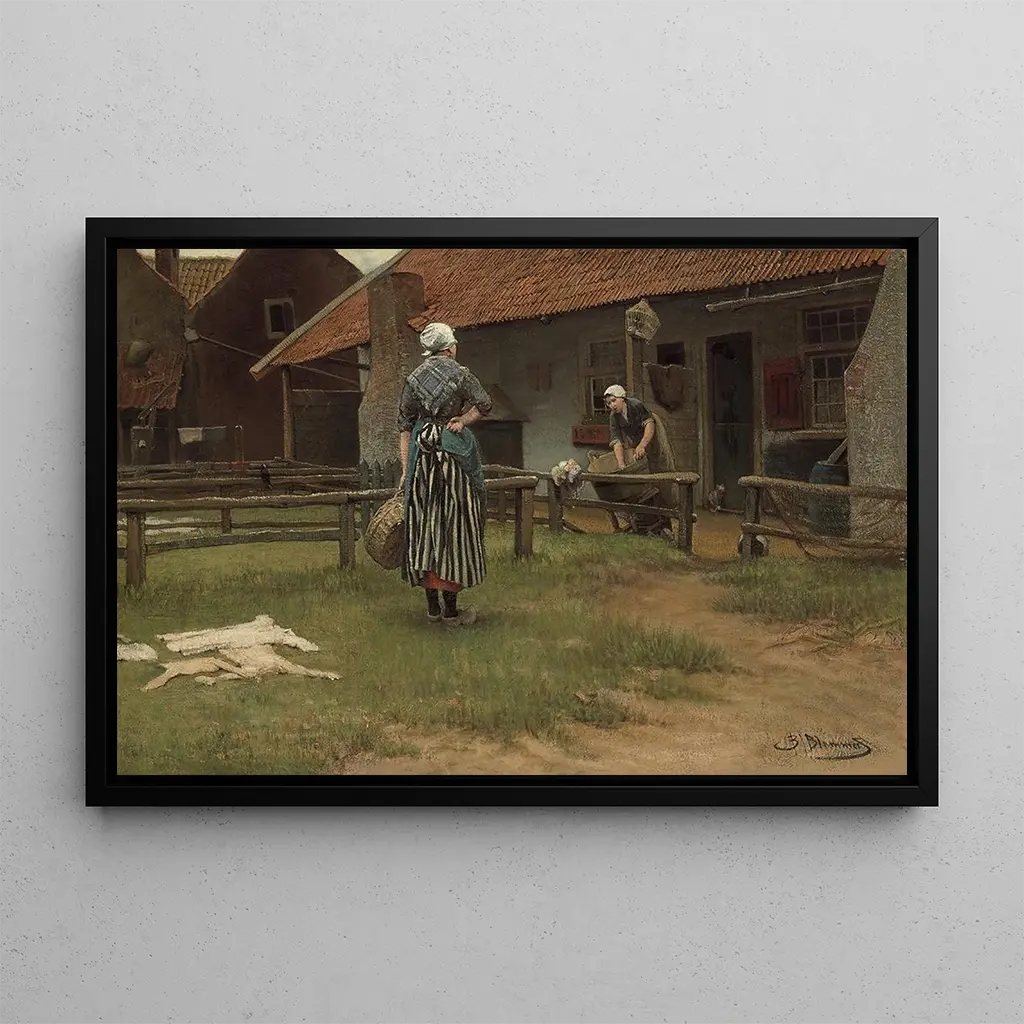 Bernardus Johannes Blommers, né en 1845 aux Pays-Bas, est reconnu pour ses représentations de la vie rurale et de la nature. Influencé par le mouvement impressionniste, il a su capturer des moments de vie avec une sensibilité particulière. Blommers a consacré sa carrière à peindre des scènes de la vie quotidienne, mettant en avant la beauté des gestes simples et des interactions humaines. Jour de lessive est un exemple parfait de son style, où il parvient à immortaliser un instant de vie avec une grande délicatesse, tout en rendant hommage à la culture néerlandaise.