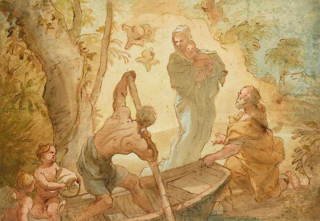 La Fuite en Égypte, œuvre emblématique de Domenico Piola, évoque un moment de paix et de protection au cœur d'une aventure tumultueuse. La composition, riche en détails, présente la Sainte Famille en route vers l'Égypte, entourée d'une nature luxuriante. Les couleurs douces et chaudes, mêlant des tons de vert et de doré, créent une atmosphère apaisante, presque rêveuse. La technique de Piola, caractérisée par des coups de pinceau délicats et une lumière subtile, accentue la profondeur de la scène, invitant le spectateur à s'immerger dans ce tableau chargé d'émotion et de spiritualité.