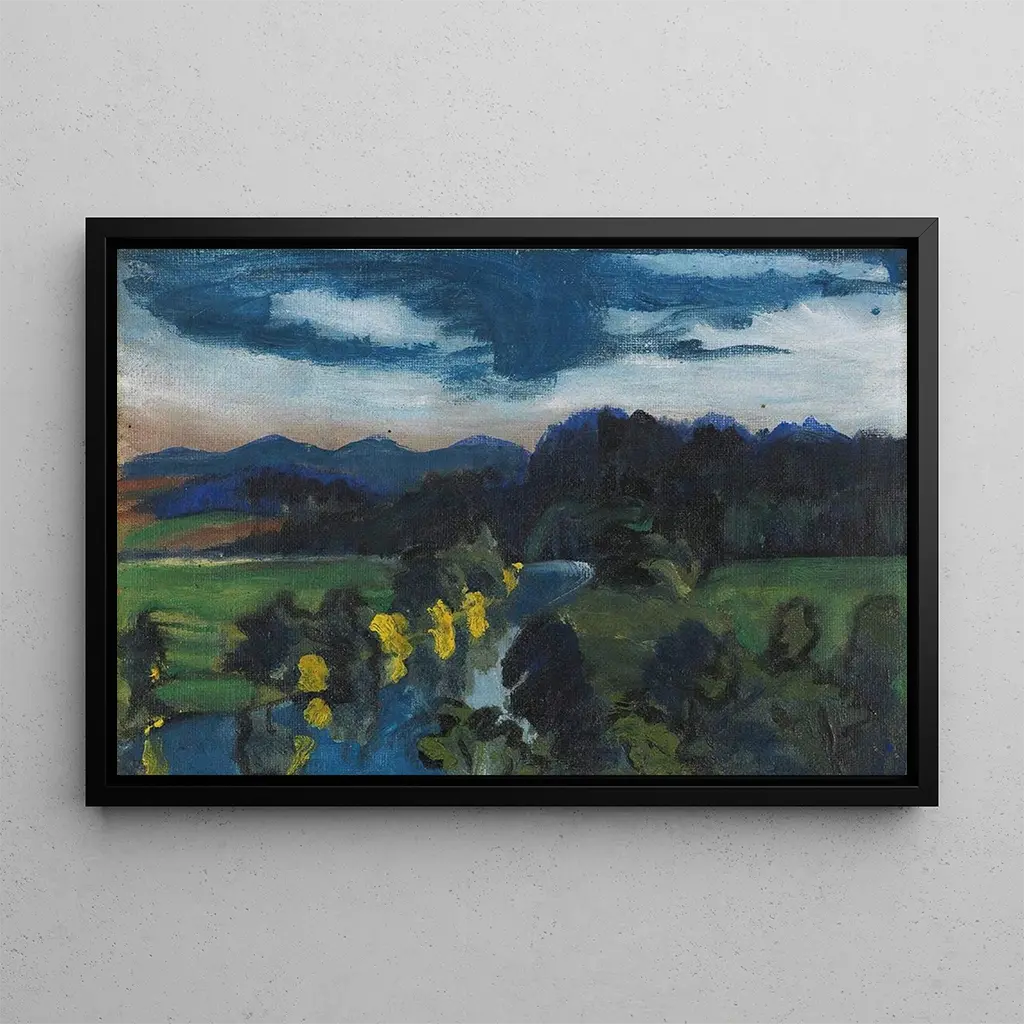 La Mulde près de Lichtenwalde est une œuvre captivante qui évoque une atmosphère à la fois paisible et dynamique. Kirchner, en utilisant des couleurs vives et des coups de pinceau audacieux, parvient à transmettre l'énergie de la nature environnante. Le tableau dépeint un paysage riverain où la lumière joue sur l'eau, créant des reflets chatoyants. Les arbres, stylisés et presque abstraits, semblent danser au gré du vent, tandis que le ciel, d'un bleu éclatant, invite à la rêverie. Cette reproduction de La Mulde près de Lichtenwalde est une véritable invitation à la contemplation de la beauté naturelle.