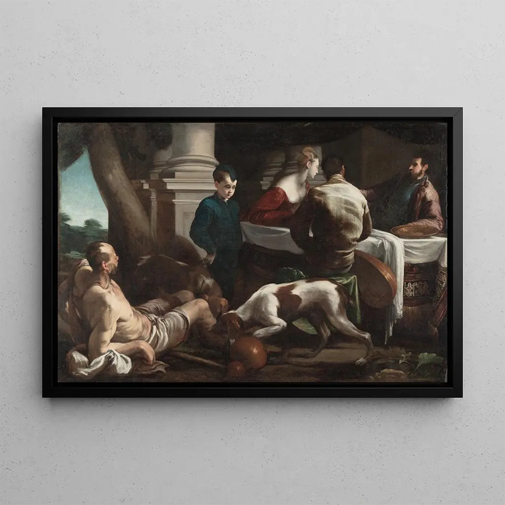 W "Lazare i bogaty", Jacopo Bassano przenosi nas w scenę biblijną pełną głębi emocjonalnej. Dynamiczna kompozycja, w której postacie są ułożone tak, aby tworzyć namacalną napięcie, od razu przyciąga wzrok. Ciepłe i ziemiste kolory, typowe dla sztuki renesansu, wzmacniają dramatyczną atmosferę sceny. Subtelnie manipulowane światło podkreśla twarze bohaterów, uwydatniając ich wyraz cierpienia i rozpaczy. To płótno, bogate w szczegóły, zachęca do refleksji nad kondycją ludzką i poszukiwaniem zbawienia.