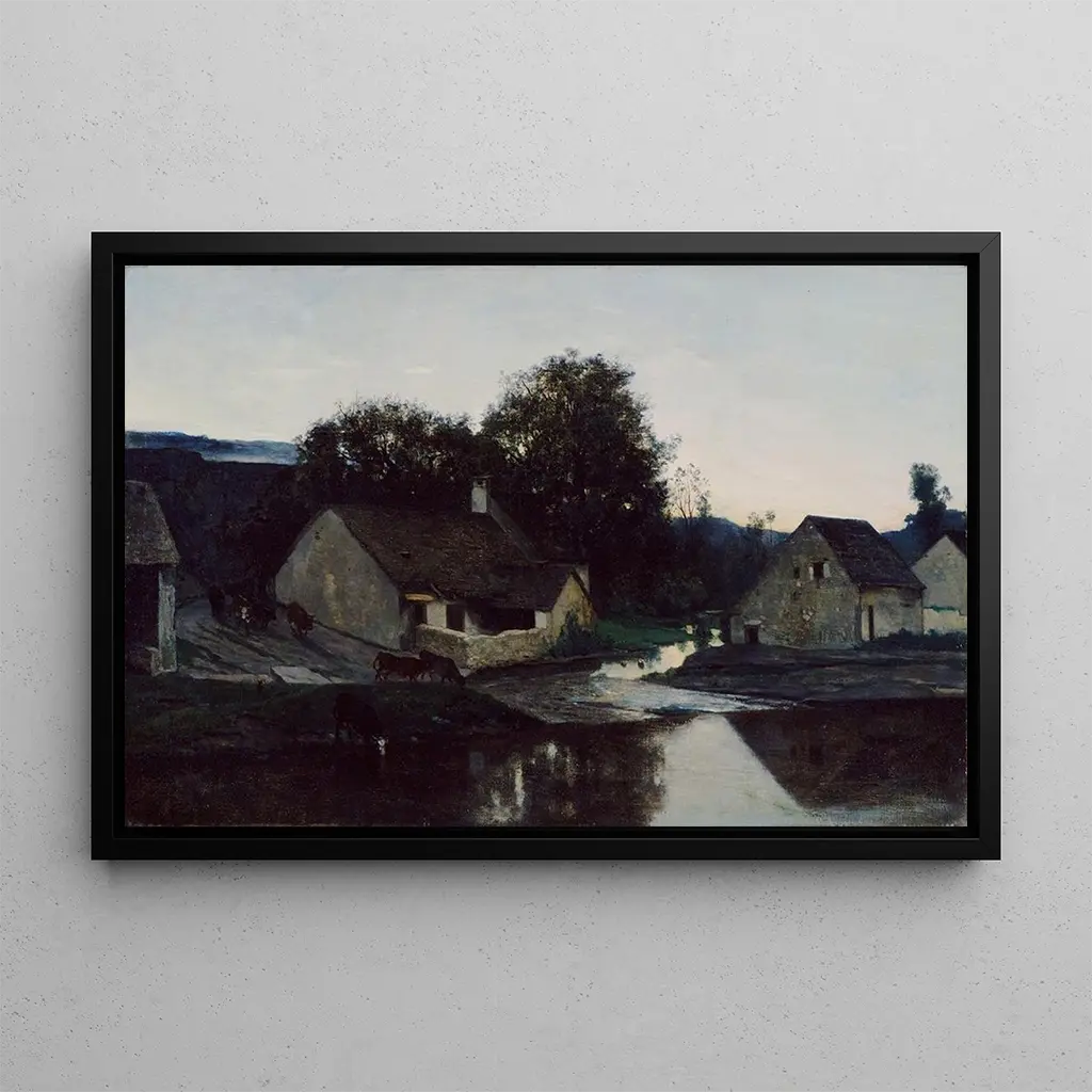 La druk artystyczny de Le Hameau d'Optevoz de Charles François Daubigny transporte le spectateur dans un paysage paisible, où la nature et l'architecture se rencontrent harmonieusement. Les teintes douces et lumineuses évoquent une lumière dorée, tandis que les détails des maisons et des arbres créent une atmosphère de tranquillité. La technique de Daubigny, caractérisée par des coups de pinceau rapides et expressifs, donne vie à cette scène rurale. Chaque élément, des nuages aux reflets dans l'eau, contribue à une composition équilibrée qui invite à l'évasion et à la contemplation.