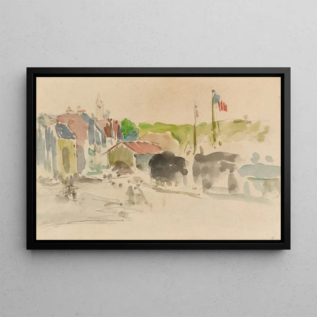 Dans "Le Village", Paul Gauguin nous transporte au cœur d'une scène bucolique, où les maisons colorées se mêlent à la verdure luxuriante. Les teintes chaudes de jaune et d'orange contrastent avec les bleus profonds du ciel, créant une atmosphère à la fois joyeuse et apaisante. La technique de la peinture à l'huile, caractéristique de Gauguin, se manifeste par des coups de pinceau audacieux et expressifs, donnant vie à chaque élément du tableau. L'œuvre invite à contempler la simplicité et la beauté de la vie rurale, tout en évoquant une nostalgie pour un monde moins industrialisé.