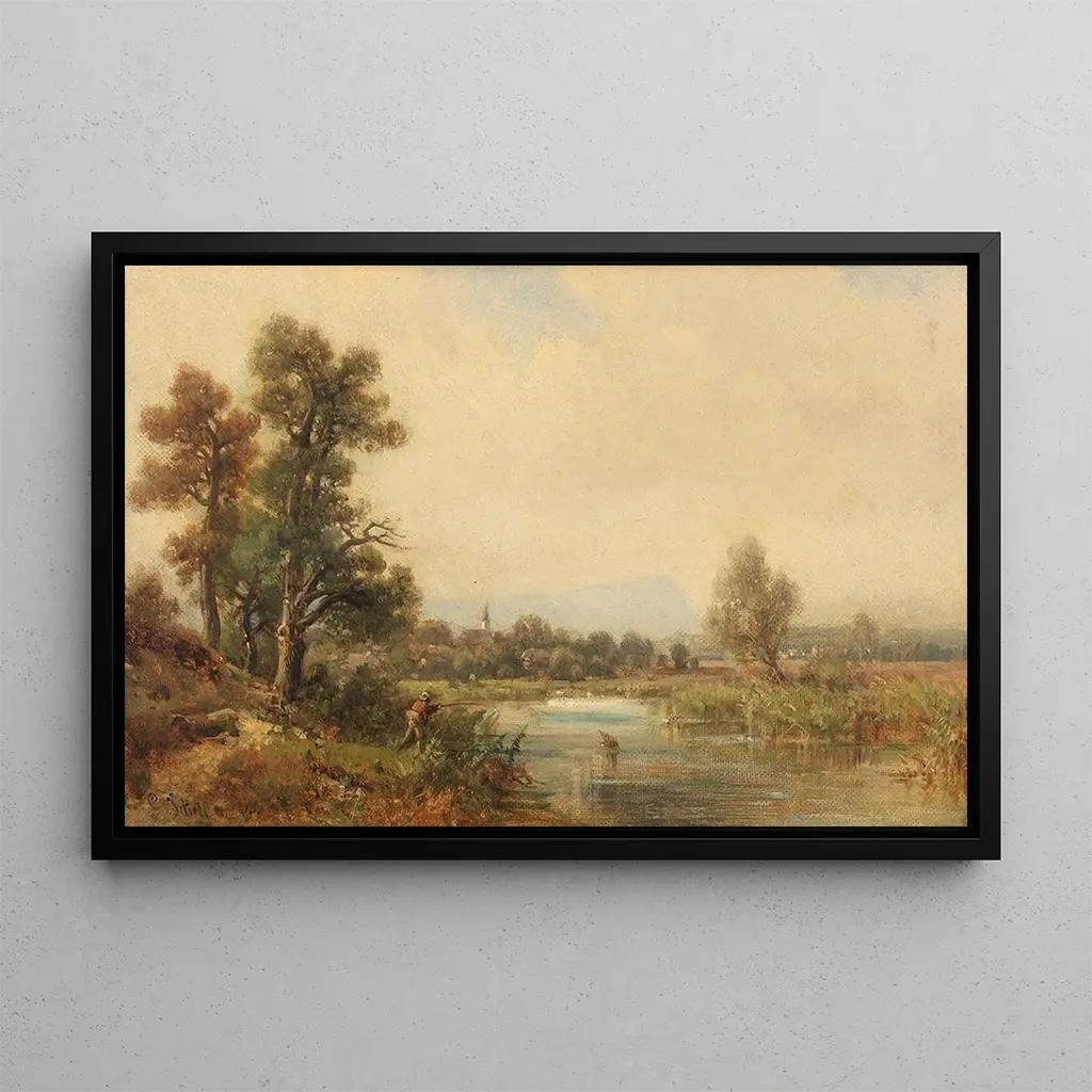 "Mała scena nad rzeką" Ludwiga Sckella wywołuje kojący spokój, uchwycając ulotny moment nad brzegiem wody. To delikatne dzieło ukazuje idylliczny pejzaż, w którym rzeka leniwie meandruje, otoczona bujną zielenią. Odmiany niebieskiego i zielonego harmonijnie się przenikają, tworząc atmosferę spokoju i harmonii. Technika Sckella, łącząca finezję i precyzję, pozwala odczuć miękkość wody i świeżość powietrza. Każdy szczegół, od odbić na powierzchni wody po cienie drzew, przyczynia się do zanurzenia widza w tym idyllicznym krajobrazie.