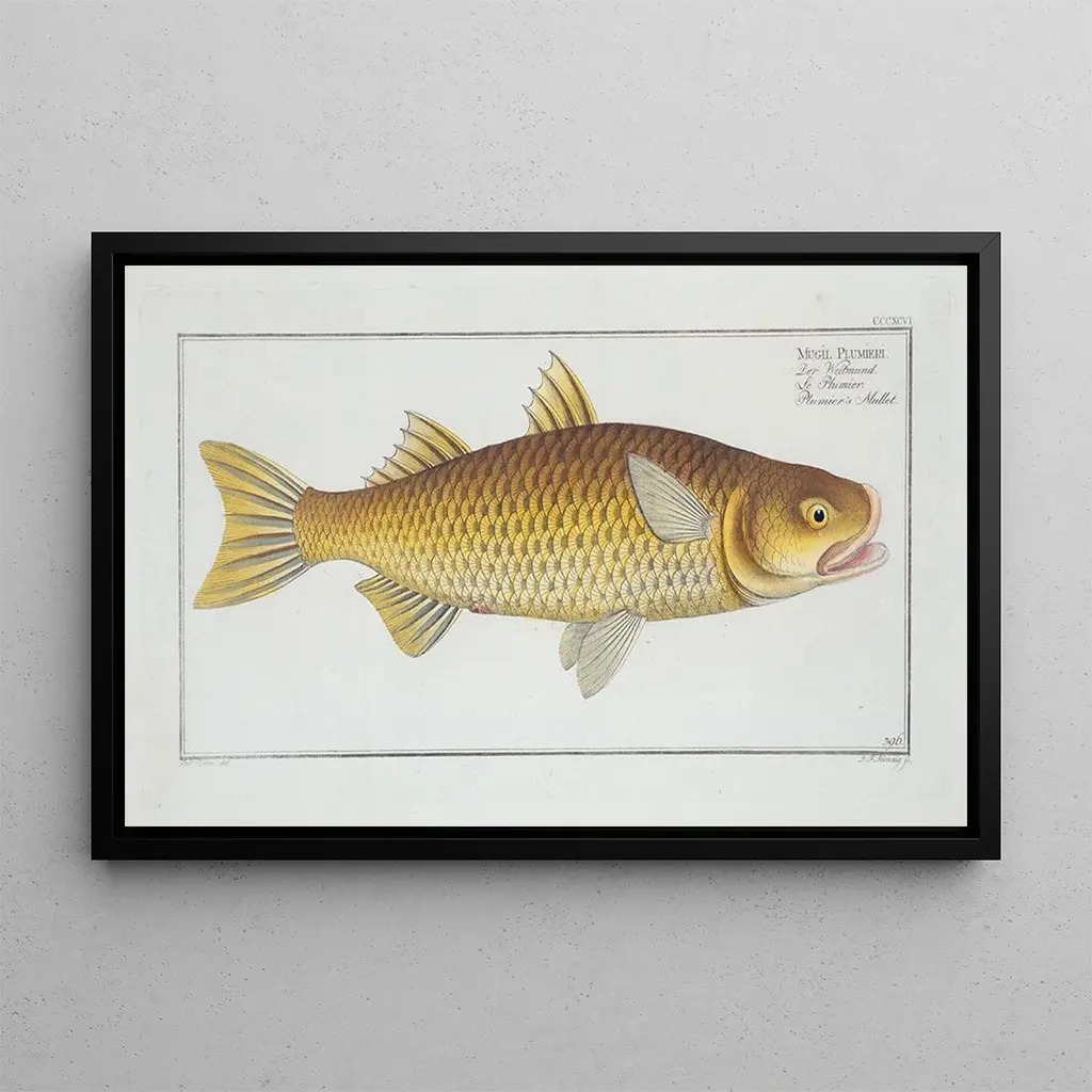 Druk artystyczny Mugil Plumeri, le Mulet de Plumer, przenosi nas w świat wodny dzięki precyzji i realizmowi Marcusa Eliesera Blocha. Ten obraz ukazuje muleta, ikoniczną rybę, przedstawioną z dbałością o szczegóły anatomiczne. Odcienie niebieskiego i zielonego nawiązują do głębin morskich, podczas gdy światło gra na łuskach, tworząc fascynujący efekt połysku. Technika Blocha, łącząca akwarelę i rytunek, pozwala oddać hołd pięknu podwodnej fauny, oferując zarówno naukową, jak i artystyczną wizję tego zwierzęcia.