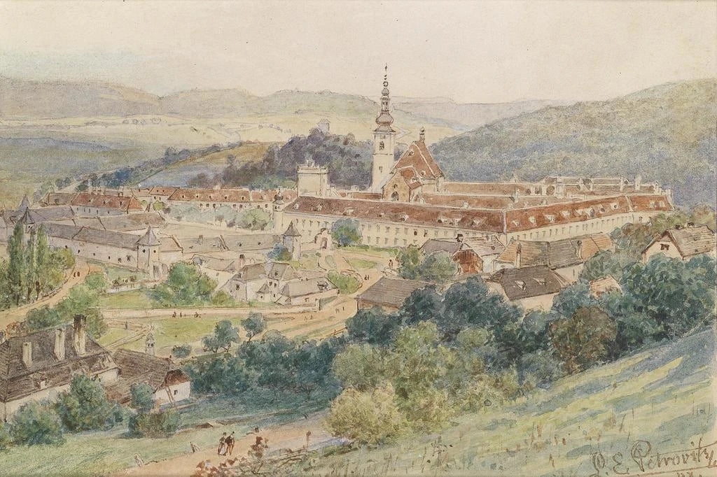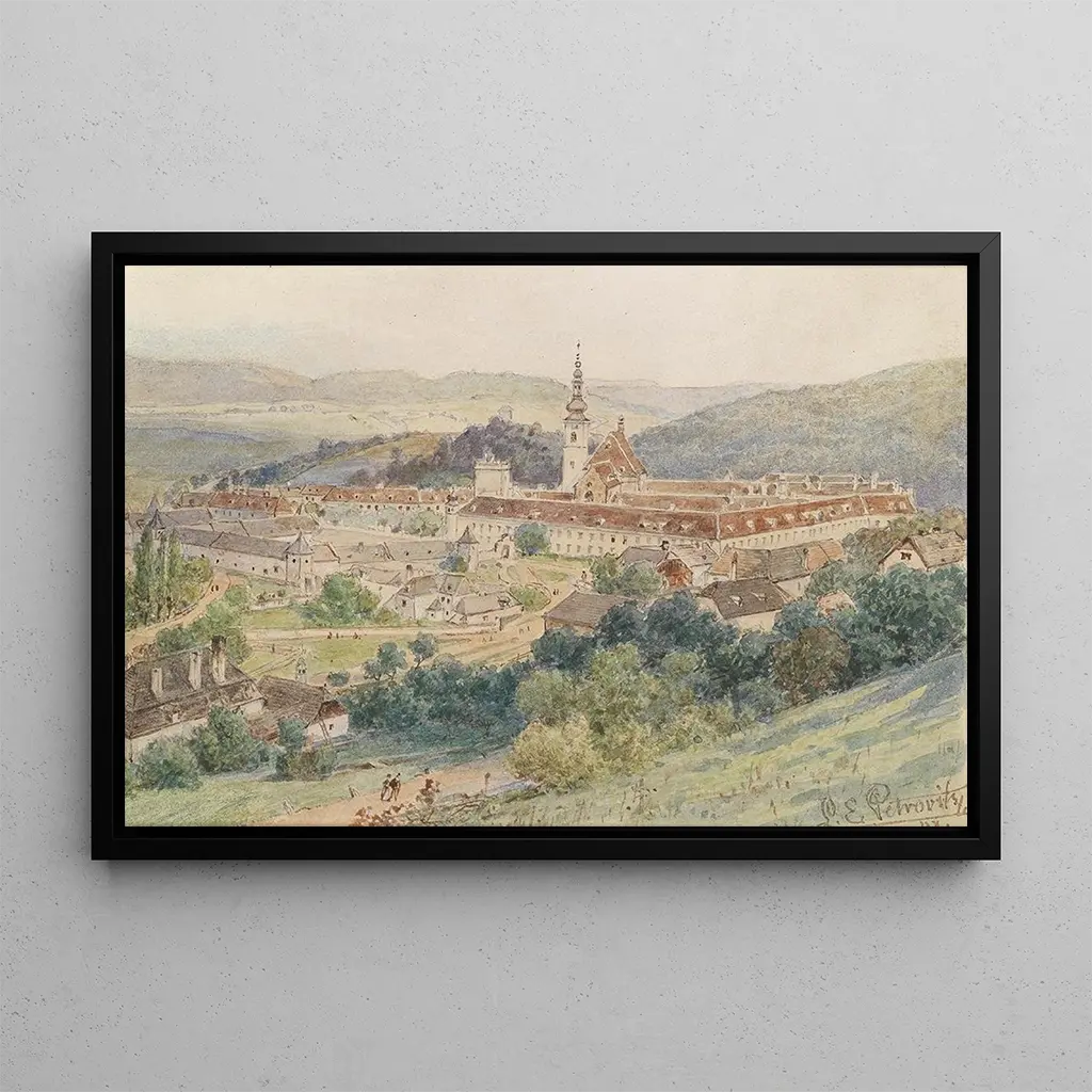 Ladislaus Eugen Petrovits, aktywny na początku XX wieku, jest znany z przedstawiania zabytków historycznych. Pod wpływem romantyzmu, potrafił uchwycić esencję budowli z niezwykłą precyzją. Jego prace wpisują się w okres, gdy gotycka i barokowa architektura była na nowo odkrywana, co wywołało odrodzenie zainteresowania dziedzictwem kulturowym. Petrovits był również inspirowany podróżami po Europie, co pozwoliło mu wprowadzić do swoich dzieł różnorodne elementy. Reprodukcja opactwa w Heiligenkreuz jest jednym z wielu obrazów, które świadczą o jego talencie i zaangażowaniu w zachowanie historii poprzez sztukę.