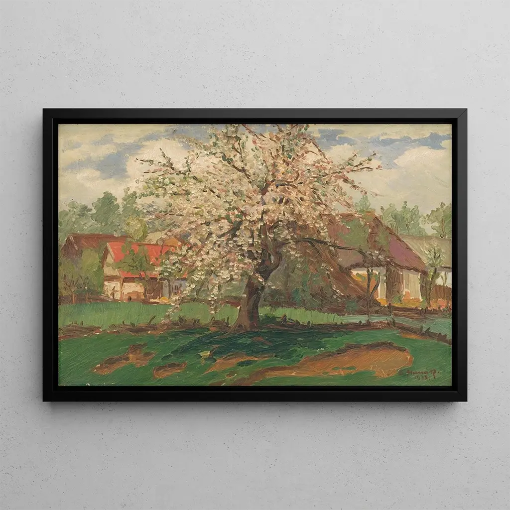 W tej reprodukcji obrazu "Krajobraz z kwitnącymi drzewami" artysta Bohumil Hanek przenosi nas do sielskiego świata, gdzie natura budzi się z blaskiem. Pastelowe kolory dominują na płótnie, tworząc łagodną i uspokajającą atmosferę. Delikatnie namalowane kwitnące drzewa zdają się drgać pod promieniami słońca, podczas gdy jasnoniebieskie niebo dodaje odrobiny spokoju. Technika akwareli, używana z finezją, pozwala oddać subtelne odcienie kwiatów i liści, zapraszając widza do głębokiej kontemplacji tego idyllicznego krajobrazu.