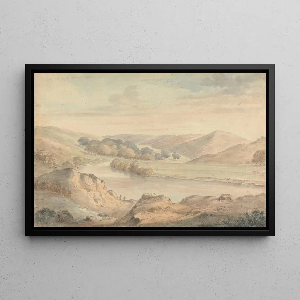 W tej reprodukcji Près de Torrington, Devonshire, Kapitan Francis Grose przenosi nas w serce kojącego angielskiego krajobrazu. Delikatne odcienie zieleni i niebieskiego harmonijnie się łączą, tworząc atmosferę spokoju. Technika malarstwa olejnego pozwala uchwycić subtelne niuanse światła, które odbija się od wody i rozświetla liście. Kompozycja, z jej płynnymi liniami i organicznymi kształtami, zachęca do kontemplacji, przypominając spokojny spacer po angielskiej wsi.