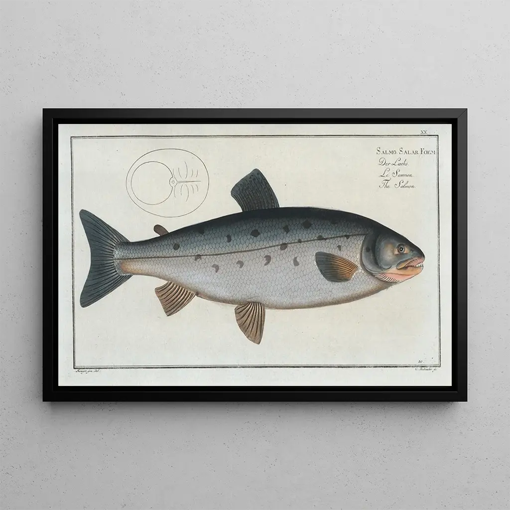 Marcus Elieser Bloch, naturaliste et artiste allemand du XVIIIe siècle, est reconnu pour ses contributions à l'illustration zoologique. Ses œuvres, qui combinent art et science, ont joué un rôle essentiel dans la documentation des espèces marines. Bloch a voyagé à travers l'Europe, observant et étudiant la faune aquatique, ce qui lui a permis de créer des illustrations d'une précision remarquable. "Salmo salar" fait partie de son ouvrage monumental, "Ichthyologie", qui a influencé les générations suivantes d'artistes et de scientifiques. Son approche méticuleuse et son souci du détail font de lui une figure incontournable dans l'histoire de l'art et de la biologie.