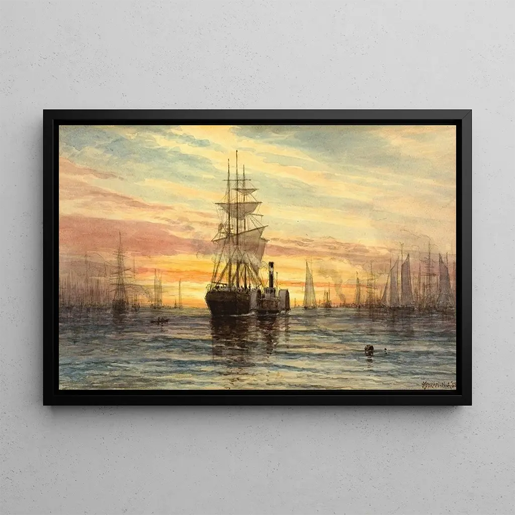 La reproduction Scène de port de Thomas Moran nous plonge dans une atmosphère vibrante et dynamique, où les nuances de bleu et de vert se mêlent harmonieusement pour évoquer la mer et le ciel. Les voiles blanches des bateaux se détachent sur le fond coloré, créant un contraste saisissant qui attire le regard. Moran, maître de la lumière, joue avec les reflets sur l'eau, rendant la scène presque vivante. Chaque détail, des vagues aux silhouettes des marins, est soigneusement rendu, invitant le spectateur à ressentir le mouvement et l'énergie de ce port animé.