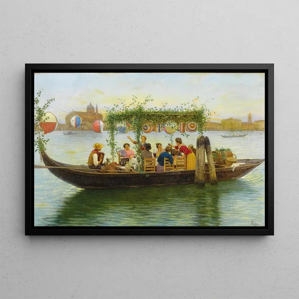 "Un dîner festif" de Luigi Pastega capture l'essence même de la convivialité autour d'une table généreusement garnie. Les personnages, joyeux et animés, semblent partager un moment de bonheur et de partage, tandis que les couleurs vives et les détails minutieux de la composition évoquent une atmosphère chaleureuse et accueillante. La technique de Pastega, alliant réalisme et touches impressionnistes, donne vie à cette scène, permettant au spectateur de ressentir l'énergie et l'enthousiasme qui émanent de ce rassemblement festif.