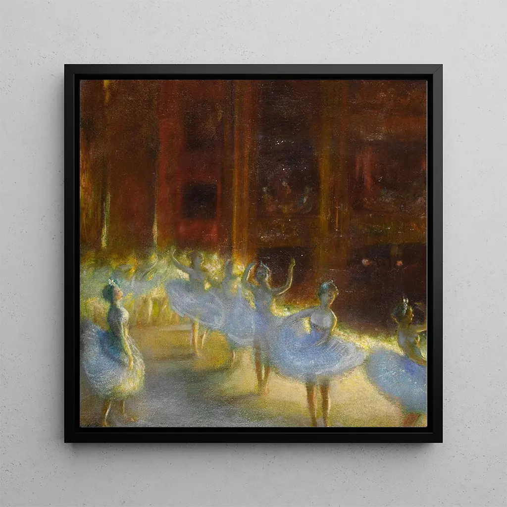Gaston La Touche, francuski malarz aktywny na przełomie XIX i XX wieku, zasłynął z eleganckich scen rodzajowych, wyrafinowanych pasteli i wyostrzonego wyczucia scen społecznych. Pod wpływem impresjonizmu, a jednocześnie pielęgnując własną dekoracyjną wrażliwość, potrafił oddać świat towarzyski i prywatne chwile z charakterystyczną wizualną poezją. Jego dzieła, często pochwały życia towarzyskiego, lecz traktowane z lekkością, przyczyniły się do odnowienia gustu dekoracyjnego swojej epoki. Druk artystyczny tego obrazu Le ballet wpisuje się w tę tradycję finezji i malarskiego uroku.