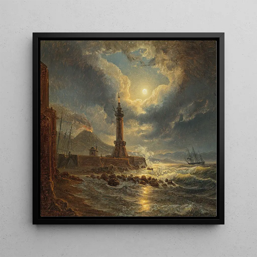 Scena z Latarnia morska w porcie Neapolu w blasku księżyca rozgrywa się w palecie głębokich błękitów i srebra, gdzie księżycowe światło obrysowuje sylwetki statków i nabrzeży. Joseph Rebell tworzy zrównoważoną kompozycję między spokojnym morzem a architekturą portową, używając delikatnych laserunków i pracy światła, które nadają całości medytacyjną i lekko nostalgiczną atmosferę. Odbicia na wodzie, subtelne akcenty żagli i uspokajająca obecność latarni morskiej tworzą poczucie intymności i powściągliwego ruchu, zaproszenie do nocnej kontemplacji.