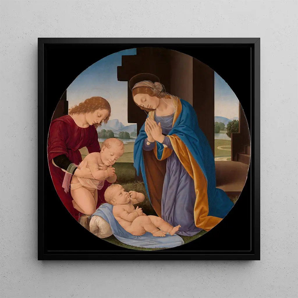 Kompozycja celebruje intymną bliskość między Maryją a Dzieciątkiem, otoczonymi przez młodego Jana Chrzciciela i anioła, w delikatnej i jasnej palecie. Subtelne karnacje, starannie ułożone draperie i subtelne użycie sfumato tworzą medytacyjną, niemal muzyczną atmosferę, gdzie każdy wzrok uchwyca spokój chwili. Precyzyjny pociągnięcie pędzla i wypolerowane wykończenie świadczą o technicznym mistrzostwie Lorenzo di Credi, który stawia na równowagę między realizmem a idealizacją. Ta druk artystyczny Madonny adorującej Dzieciątko z Świętym Janem Chrzcicielem i Aniołem wiernie oddaje delikatność i klarowność oryginału.