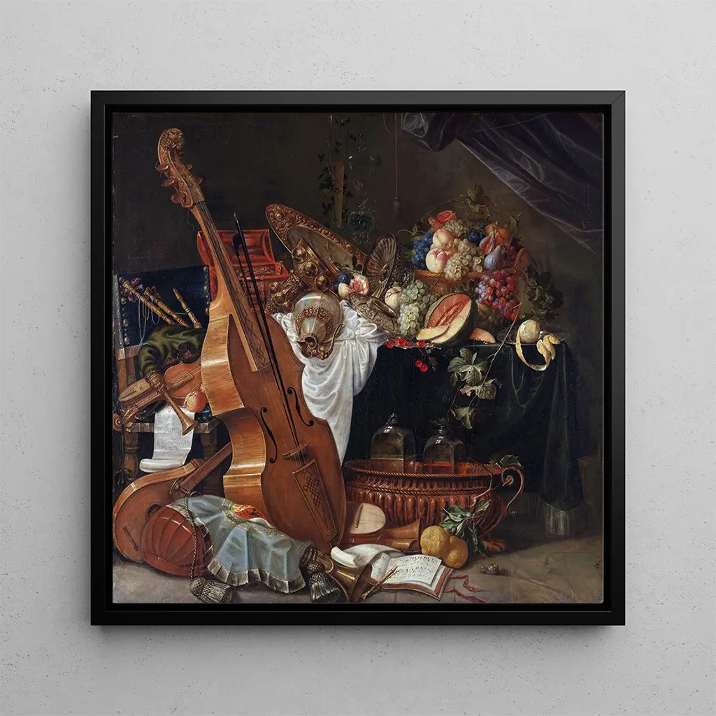 Kompozycja Nature morte ukazuje wyrafinowaną równowagę między prostymi przedmiotami a subtelnym światłem, gdzie każda faktura — skórka owocu, metaliczny refleks, splot tkaniny — jest oddana z delikatną precyzją. Paleta faworyzuje ciepłe, stonowane tony, przełamane jasnymi akcentami, które kierują wzrok i tworzą kontemplacyjną atmosferę. Technika malarska, wierna klasycznemu realizmowi, podkreśla gęstość form i głębię przestrzeni malarskiej. Ten druk artystyczny Nature morte oddaje spokojną emocję sceny, podkreślając jednocześnie dbałość o detale charakterystyczną dla Johanna Friedricha Gruebera.