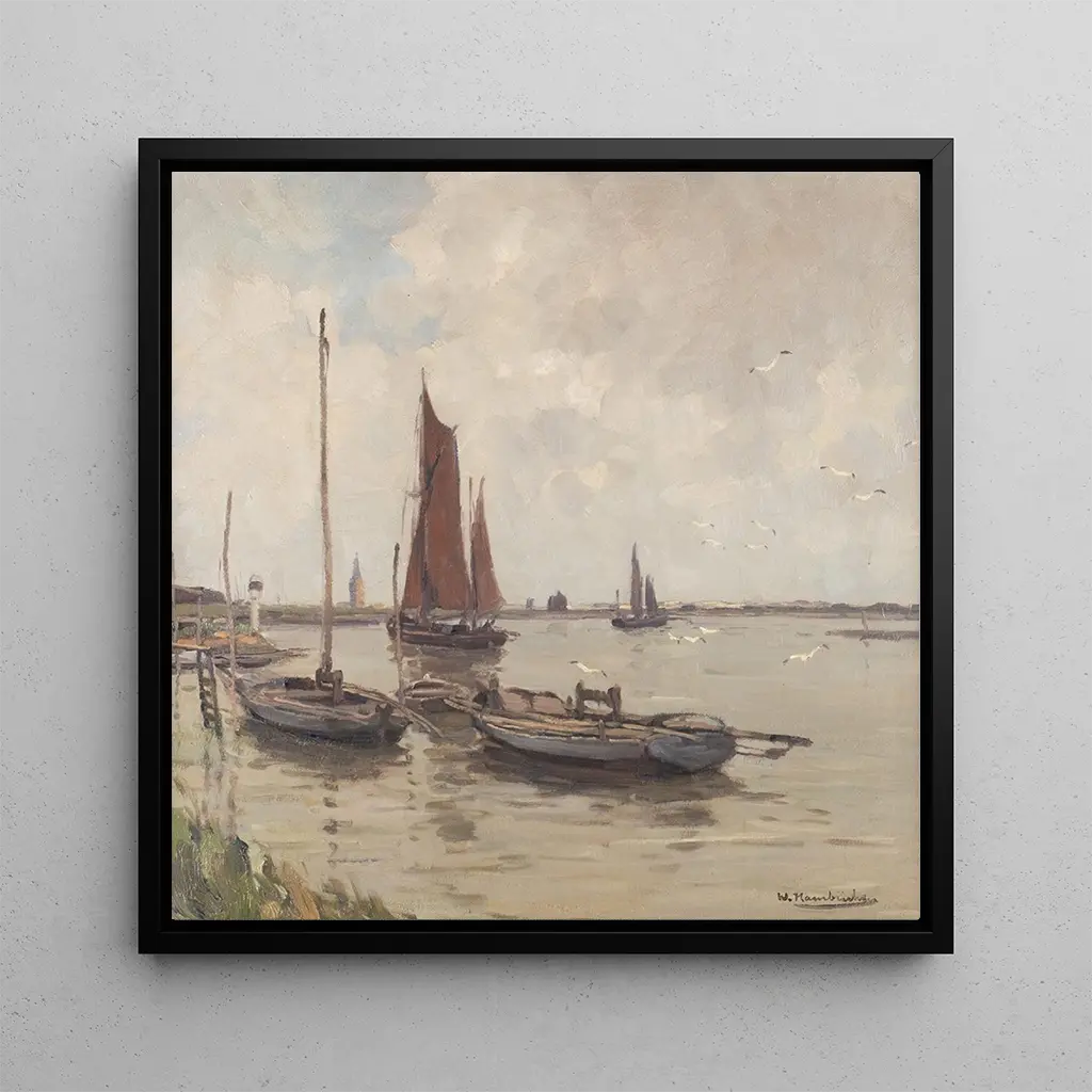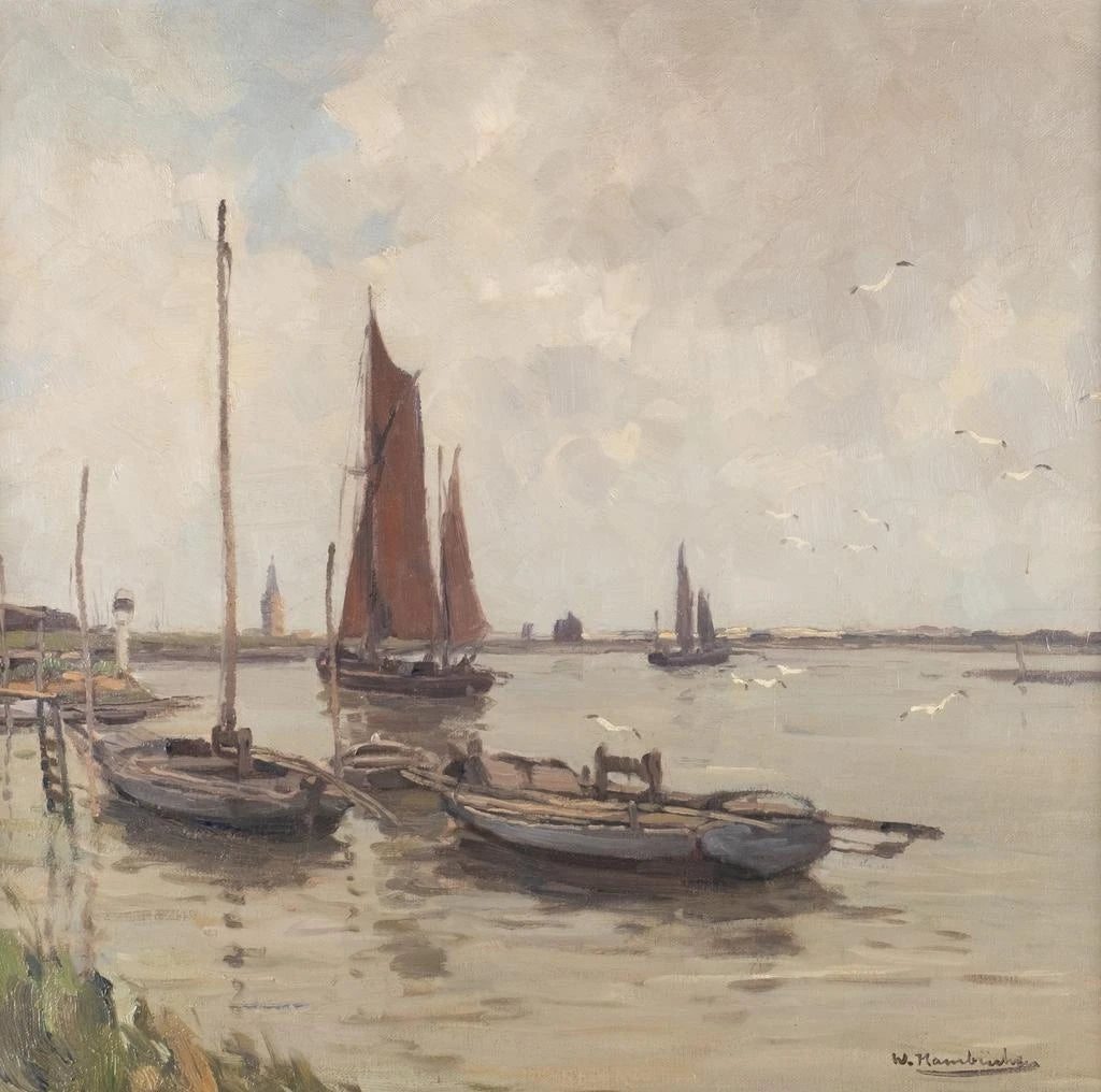 W tej uderzającej scenie Wilhelm Hambchen uchwycił spokojną i lekko mglistą atmosferę brzegów rzeki Yser. Kompozycja faworyzuje szerokie płaszczyzny wody i niskie linie horyzontu, gdzie odcienie szaro-niebieskiego, ochry i zieleni mieszają się z odrobiną złotego światła. Pociągnięcia są precyzyjne, lecz delikatne, na przemian szczegółowe fragmenty i jasne plamy sugerują wilgotne powietrze i poranny spokój. Całość emanuje kontemplacyjną emocją: pejzaż jednocześnie intymny i rozległy, zapraszający do medytacji i marzeń.