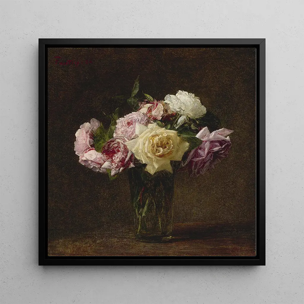 Malarz XIX wieku, znany z martwych natur i portretów, Henri Fantin-Latour zyskał sławę dzięki precyzji i wrażliwości swojego botanicznego odwzorowania. Pod wpływem akademizmu i niemal naukowej dbałości o szczegóły, spopularyzował bukiet jako temat malarski, łącząc rygorystyczną obserwację z malarską elegancją. Jego dzieła wpłynęły na florystyczną reprezentację w Europie i świadczą o dialogu między tradycją a nowoczesnością. Obraz Róże doskonale ilustruje jego sztukę światłocienia i zdolność do sublimacji codzienności poprzez malarstwo o wielkiej wyrazistej powściągliwości.