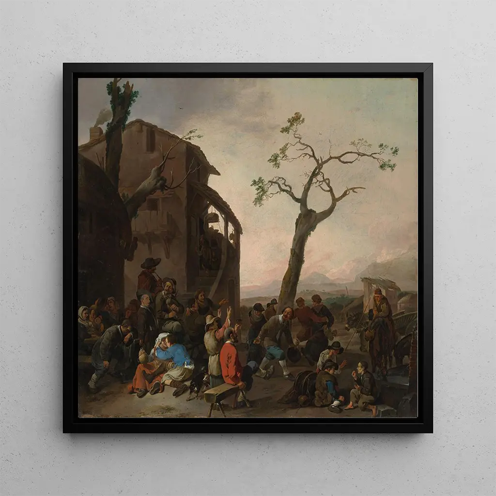 W "Paysans dansant" Johannes Lingelbach komponuje żywą scenę, gdzie światło pieści twarze i tkaniny w choreograficznym ruchu. Paleta sprzyja ciepłym ochrom i ziemistym zielenom, przełamanym żywymi akcentami, podczas gdy zdecydowane pociągnięcia pędzla oddają fakturę kostiumów i żywiołowość gestów. Atmosfera jest jednocześnie ludowa i intymna: śmiechy, zapomniane nuty i wymieniane spojrzenia tworzą migawkę życia wiejskiego. Ten druk artystyczny oddaje narracyjną gęstość i kolorystyczne napięcie, które stanowią urok obrazu.