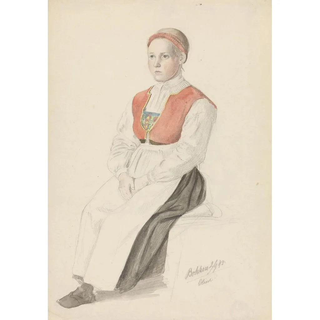 Adolph Tidemand, urodzony w 1814 roku, jest jednym z głównych artystów romantyzmu skandynawskiego, cenionym za zdolność do uwieczniania tradycji i codziennego życia swojej epoki. Wykształcony w Kopenhadze, był pod wpływem pejzaży i stylów życia Norwegii, które często przedstawiał w swoich dziełach. Tidemand umiał połączyć realizm z romantyzmem, tworząc obrazy wywołujące nostalgię za minioną epoką. Jego portrety, jak ten przedstawiający Fille en costume Oline Bukken, świadczą o jego zaangażowaniu w zachowanie i celebrowanie norweskiej tożsamości kulturowej poprzez sztukę.