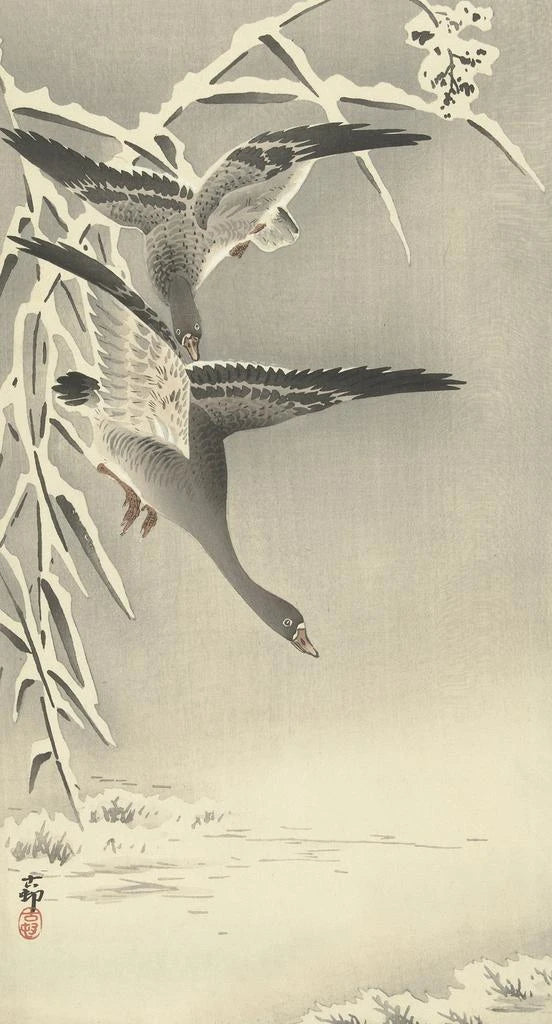 Druk artystyczny | Dwa gęsi z białą głową na tle zaśnieżonego krajobrazu - Ohara Koson