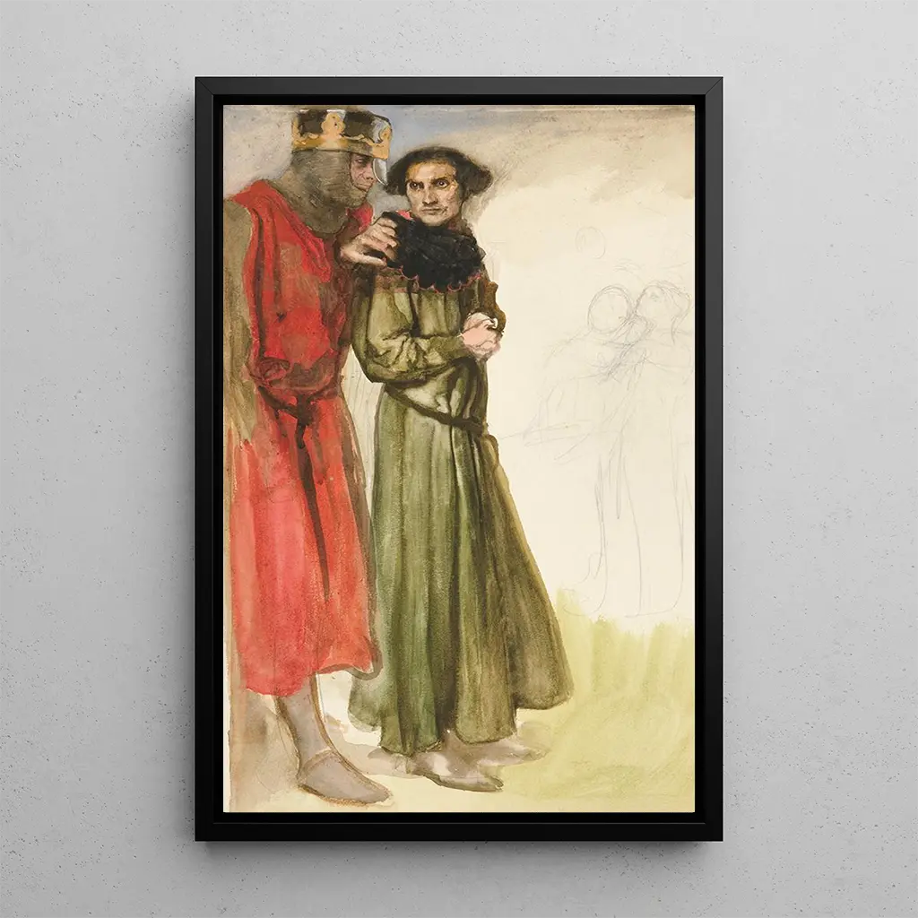Edwin Austin Abbey, urodzony w 1852 roku, jest znany z ilustracji i druków artystycznych inspirowanych dziełami teatralnymi, w szczególności tymi Szekspira. Jego styl, łączący wpływy prerafaelitów i art nouveau, wyróżnia się szczególną dbałością o detale i zdolnością do przekazywania silnych emocji. Abbey mieszkał w Anglii, gdzie był mocno inspirowany teatrem elżbietańskim i kulturą brytyjską. Jego dzieła, takie jak ta scena szekspirowska, świadczą o jego talencie do uchwycenia istoty ludzkiego dramatu, czyniąc go nieodłączną postacią sztuki końca XIX wieku.