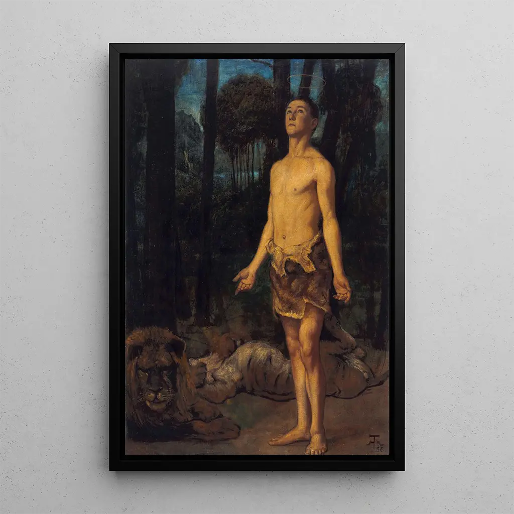 Hans Thoma, niemiecki malarz XIX wieku, jest ceniony za swój unikalny styl łączący symbolizm i romantyzm. Pod wpływem ruchów artystycznych swojego czasu, potrafił uchwycić tematy duchowe i mitologiczne z dużą wrażliwością. Thoma działał w okresie społecznych i politycznych przemian w Europie, co ukształtowało jego podejście artystyczne. Jego dzieła, często inspirowane naturą i biblijnymi opowieściami, świadczą o poszukiwaniu piękna i prawdy. Daniel w jamie lwów wpisuje się doskonale w tę tradycję, oferując refleksję nad wiarą i ludzką odpornością.