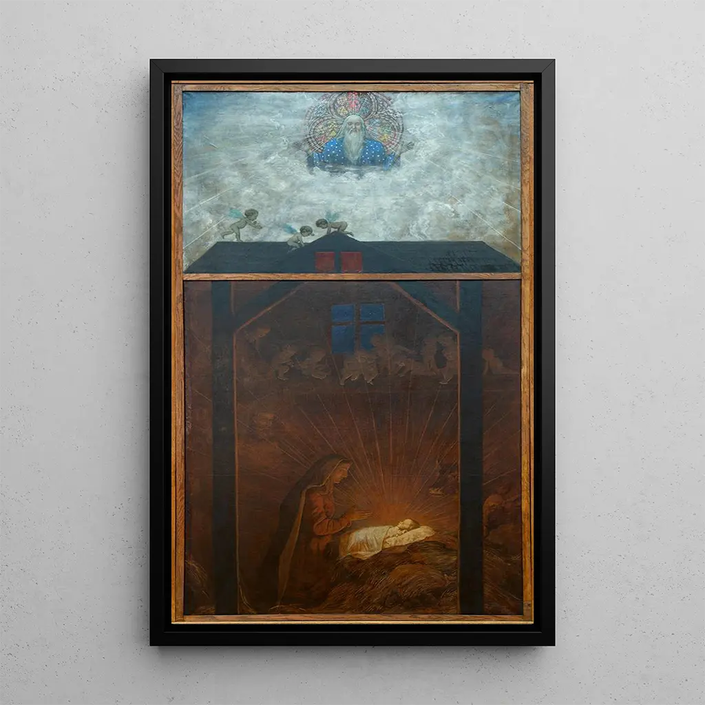Triptyk Bożego Narodzenia Uwielbienie Dzieciątka autorstwa Hansa Thomy uchwyca chwilę czystości i oddania. Kompozycja, bogata w szczegóły, przedstawia scenę, w której delikatne światło otacza Świętą Rodzinę, podkreślając niewinność Dzieciątka Jezus. Ciepłe i złote kolory tworzą przytulną atmosferę, zachęcając widza do zanurzenia się w tym świętym momencie. Technika Thomy, łącząca realizm z elementami symbolicznymi, nadaje temu dziełu duchową głębię, która przekracza czas. Każda postać, od pasterzy po zwierzęta, wydaje się uczestniczyć w tej zbiorowej adoracji, wzmacniając ideę jedności i pokoju.
