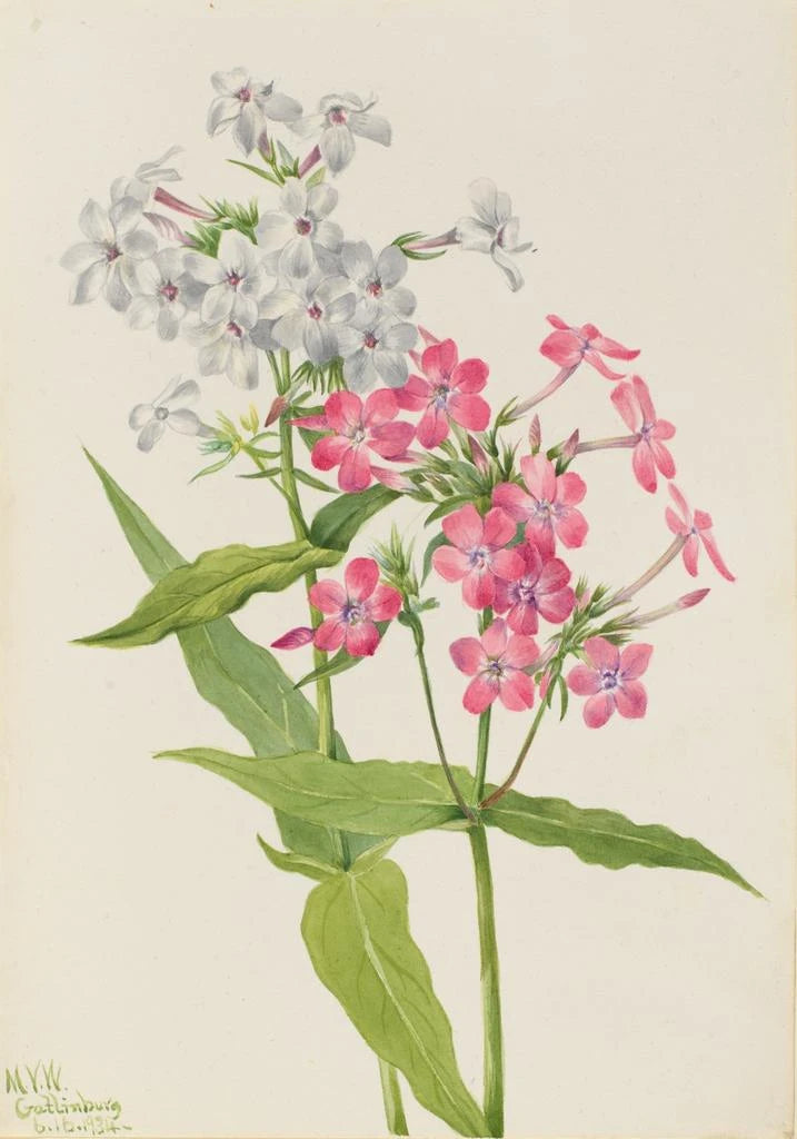 Druk artystyczny Phlox vivace, czyli Phlox paniculata, przywołuje obraz ogrodu w pełni kwitnienia, gdzie pastelowe odcienie harmonijnie się łączą. Mary Vaux Walcott, z wyostrzonym artystycznym okiem, uchwyciła istotę tej byliny, ukazując delikatność jej gwiazdkowatych kwiatów. Odmiany różu, fioletu i bieli przenikają się w żywym obrazie, podczas gdy technika akwareli dodaje całości miękkości i płynności. To dzieło zachęca do kontemplacji, przenosząc widza w uspokajający, kwiatowy świat, gdzie każdy szczegół jest starannie wyeksponowany.