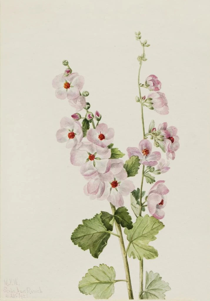 Le tableau "Mauve globe à œil orange Sphaeralcea davidsonii" de Mary Vaux Walcott est une œuvre vibrante qui capture l'essence de la flore américaine. Les couleurs mauves et orangées s'entrelacent harmonieusement, créant un contraste saisissant qui attire immédiatement le regard. La technique délicate de l’aquarelle permet de rendre la transparence des pétales et la texture des feuilles, évoquant une atmosphère de légèreté et de sérénité. Chaque détail est soigneusement observé, témoignant d'une passion pour la botanique et d'une volonté de célébrer la beauté naturelle. Cette œuvre invite à une contemplation profonde, révélant la richesse de la biodiversité.