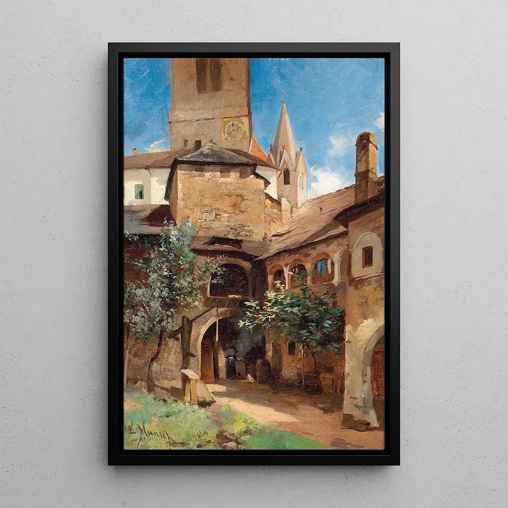 Dans "Cour de Deisener à Weissenkirchen", Leopold Munsch nous offre une vision vibrante d'une cour typique de la campagne autrichienne. Les couleurs éclatantes et les détails minutieux des personnages et des bâtiments évoquent une atmosphère de convivialité et de simplicité. La technique de Munsch, qui mêle habilement lumière et ombre, donne vie à cette scène, où chaque élément semble raconter une histoire. Les arbres verdoyants et les fleurs colorées ajoutent une touche de fraîcheur, invitant le spectateur à s'immerger dans ce moment de vie paisible.