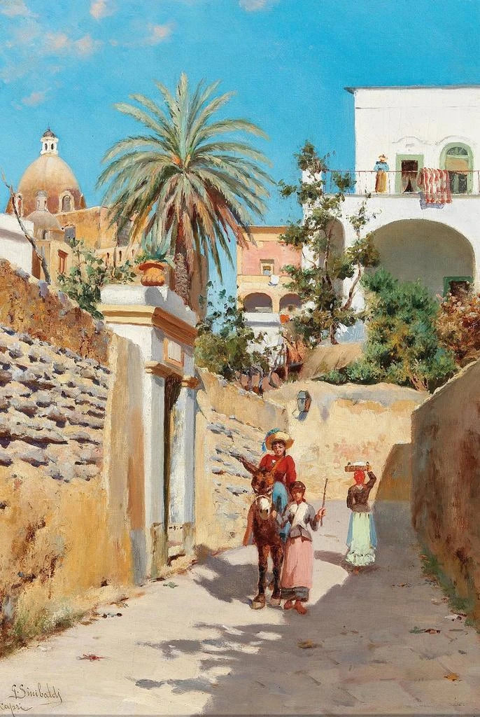 Cette œuvre, intitulée "Une allée d'été à Capri", nous transporte dans un paysage idyllique où la lumière joue avec les couleurs vives de la végétation. Goffredo Sinibaldi Paolucci capture l'essence de l'été à Capri à travers des touches de peinture délicates et vibrantes. Les nuances de vert, de bleu et de jaune se mêlent harmonieusement, créant une atmosphère à la fois sereine et envoûtante. Les ombres des arbres, les fleurs éclatantes et le ciel azur se combinent pour offrir une expérience visuelle riche, invitant le spectateur à s'imprégner de la beauté naturelle de cette île italienne.