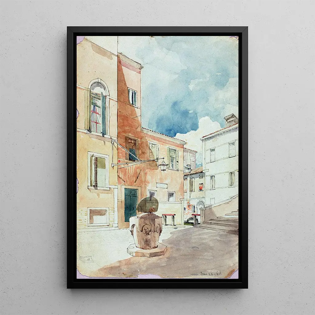 La druk artystyczny de Venise de Miner Kilbourne Kellogg évoque une atmosphère envoûtante, où les reflets des bâtiments sur l'eau créent une danse de couleurs. Les teintes douces de bleu et de rose se mêlent harmonieusement, tandis que les détails architecturaux des palais vénitiens émergent avec finesse. La technique de l'aquarelle, utilisée par Kellogg, confère à l'œuvre une légèreté et une fluidité qui rappellent les mouvements des gondoles glissant sur les canaux. Cette toile invite à une contemplation sereine, transportant le spectateur au cœur de la Sérénissime, où chaque coin de rue semble raconter une histoire.