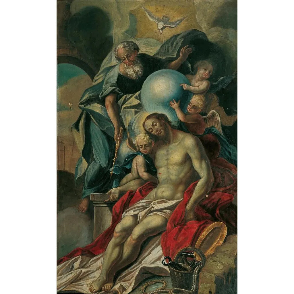 La Sainte Trinité est une représentation emblématique de la foi chrétienne, où le Père, le Fils et le Saint-Esprit se rejoignent dans une harmonie visuelle captivante. Les couleurs riches et profondes, souvent dominées par des bleus et des ors, créent une atmosphère à la fois solennelle et apaisante. La technique de la peinture, probablement à l'huile sur toile, permet de rendre les détails des visages et des drapés avec une précision remarquable. Cette œuvre invite à la contemplation, offrant un espace de réflexion sur le mystère de la foi et la relation entre les divinités.