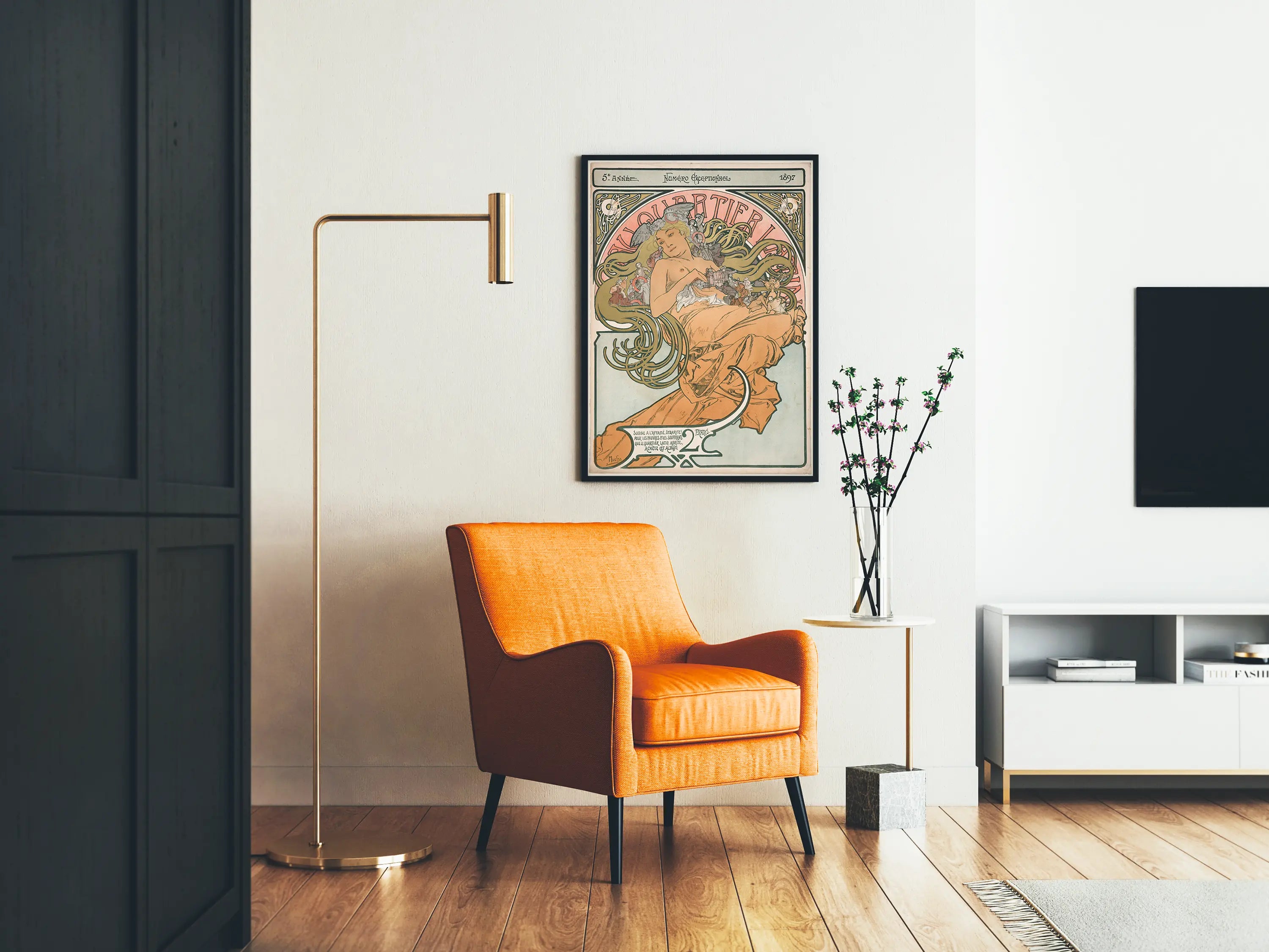 Ta plakat vintage z 1897 roku, zatytułowana „Na Dzielnicy Łacińskiej”, jest dziełem reprezentującym styl secesyjny. Oferuje unikalną i elegancką dekorację ścienną, idealną do nadania przestrzeniom retro i artystycznego uroku. Ten stary plakat przedstawia kobietę z długimi, falującymi włosami, lekko nagą, w grzecznej i marzycielskiej pozie. Jej ciało otaczają małe postacie ludzkie, przywołując scenę pełną życia i bogatą w szczegóły. Tło i kontury plakatu zdobią stylizowane motywy charakterystyczne dla ruchu secesyjnego, łączące krągłe linie i organiczne kształty z paletą delikatnych barw, głównie pomarańczowych, beżowych, zielonych i jasnoniebieskich. Ta oryginalna sztuka pierwotnie była okładką wyjątkowego numeru, z widocjnymi inskrypcjami typograficznymi wskazującymi „5. rok”, „Numer wyjątkowy” oraz rok „1897”. Tekst zachęcający nawiązuje do zakupu albumu Dzielnicy Łacińskiej, podkreślając solidarność. Ta plakat jest zarówno przedmiotem kolekcjonerskim, jak i wyjątkową dekoracją ścienną, doskonałą do wzbogacenia wnętrza o artystyczny i historyczny klimat. Doskonale komponuje się w salonie, biurze lub przestrzeni do czytania, dodając wyrafinowanego i kulturalnego akcentu. Wybierając ten vintage’owy plakat, decydujesz się na graficzny i estetyczny obraz, symbol bogactwa artystycznego końca XIX wieku, idealny dla miłośników oryginalnej dekoracji ściennej i pasjonatów historii sztuki.