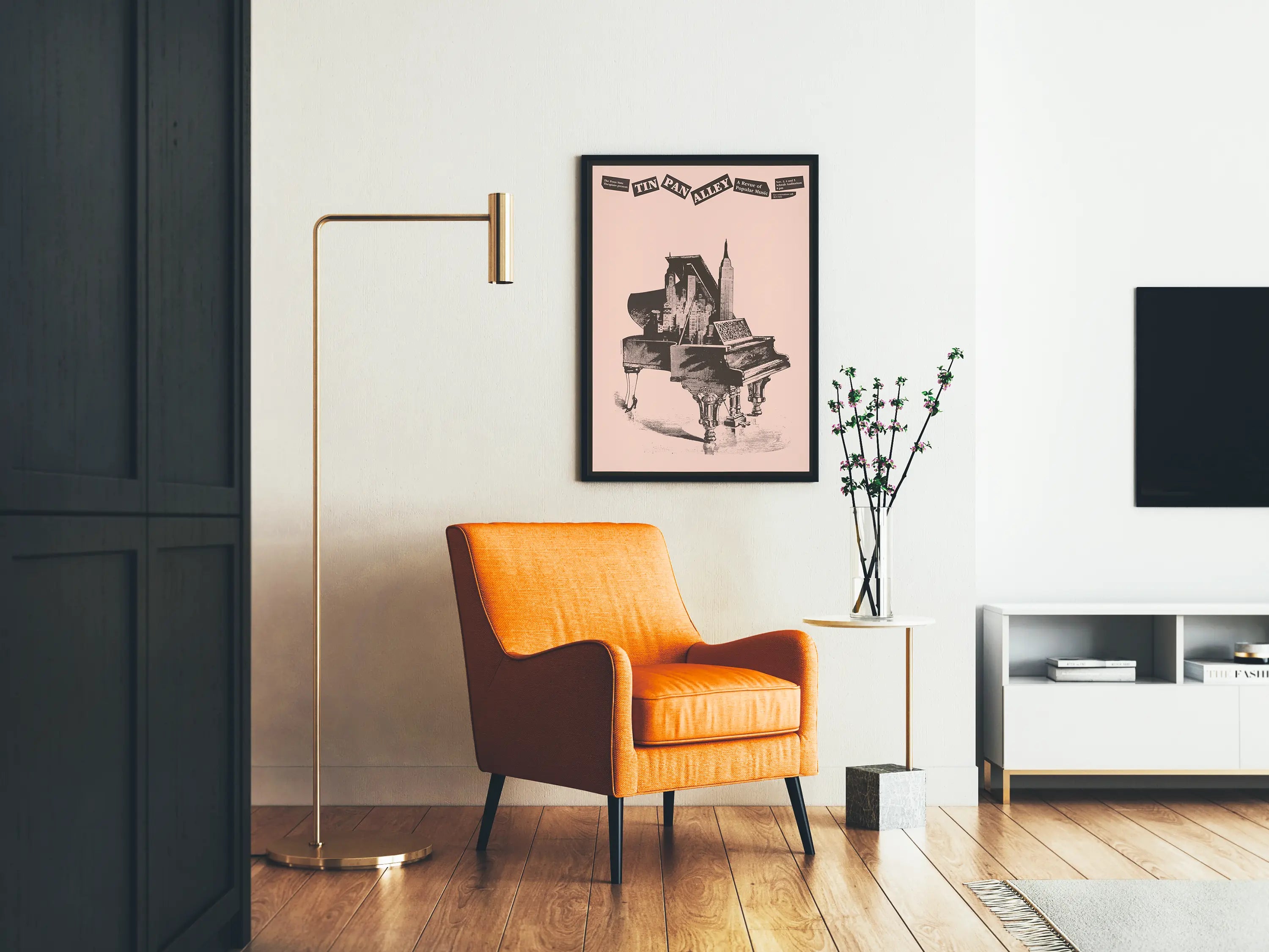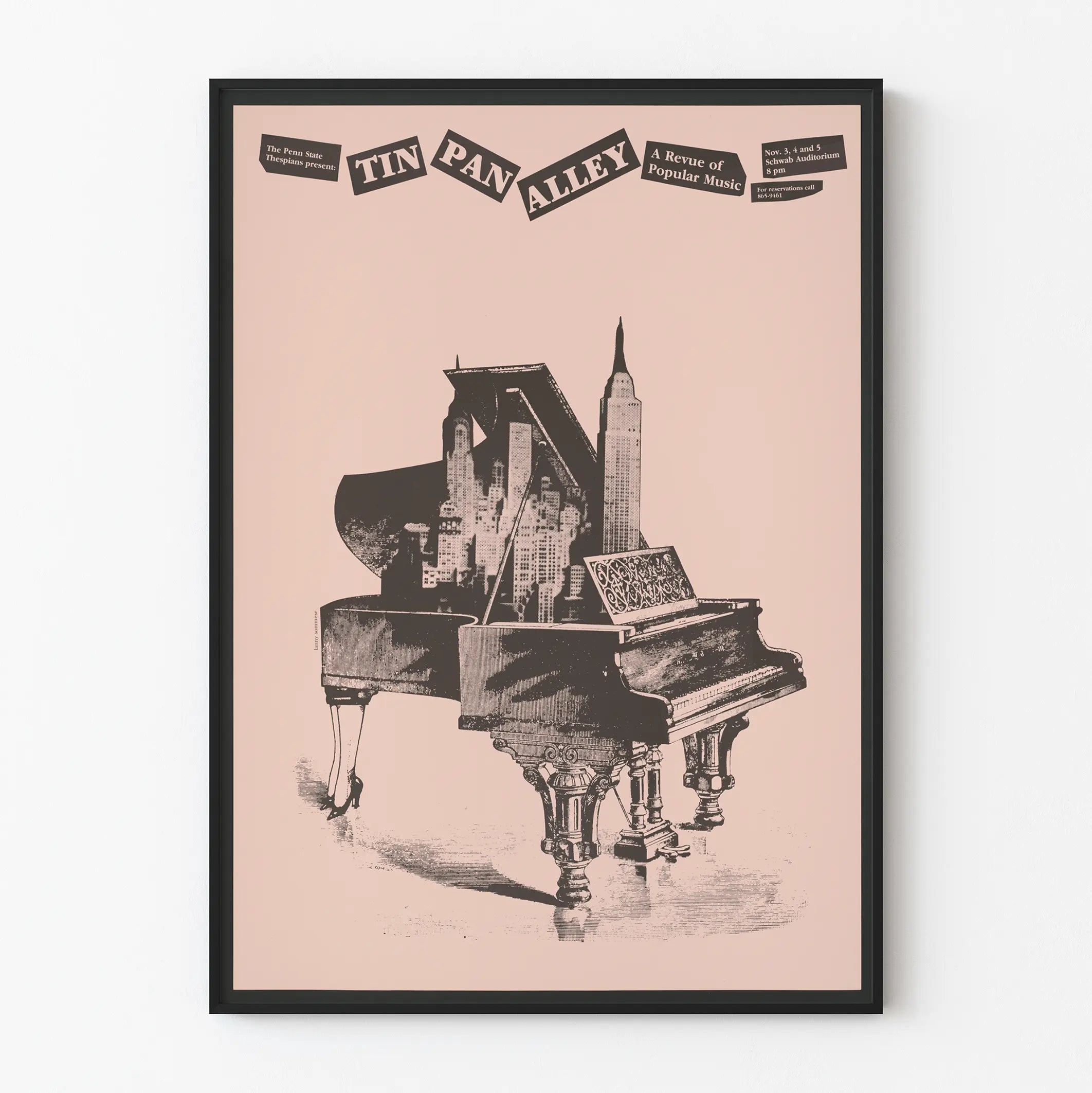 Ta stylizowana plakatowa ilustracja przedstawia pianino koncertowe, którego klapa się unosi, ukazując sylwetkę miejską, przypominającą panoramę drapaczy chmur. Ta oryginalna graficzna reprezentacja symbolizuje połączenie muzyki popularnej z atmosferą wielkich miast, będąc wizualnym hołdem dla słynnego czasopisma muzycznego "Tin Pan Alley". Na jednolitym, jasnoróżowym tle, czarny kolor ilustracji tworzy wyraźny kontrast, przyciągając wzrok i dodając elegancji tej dekoracji ściennej.