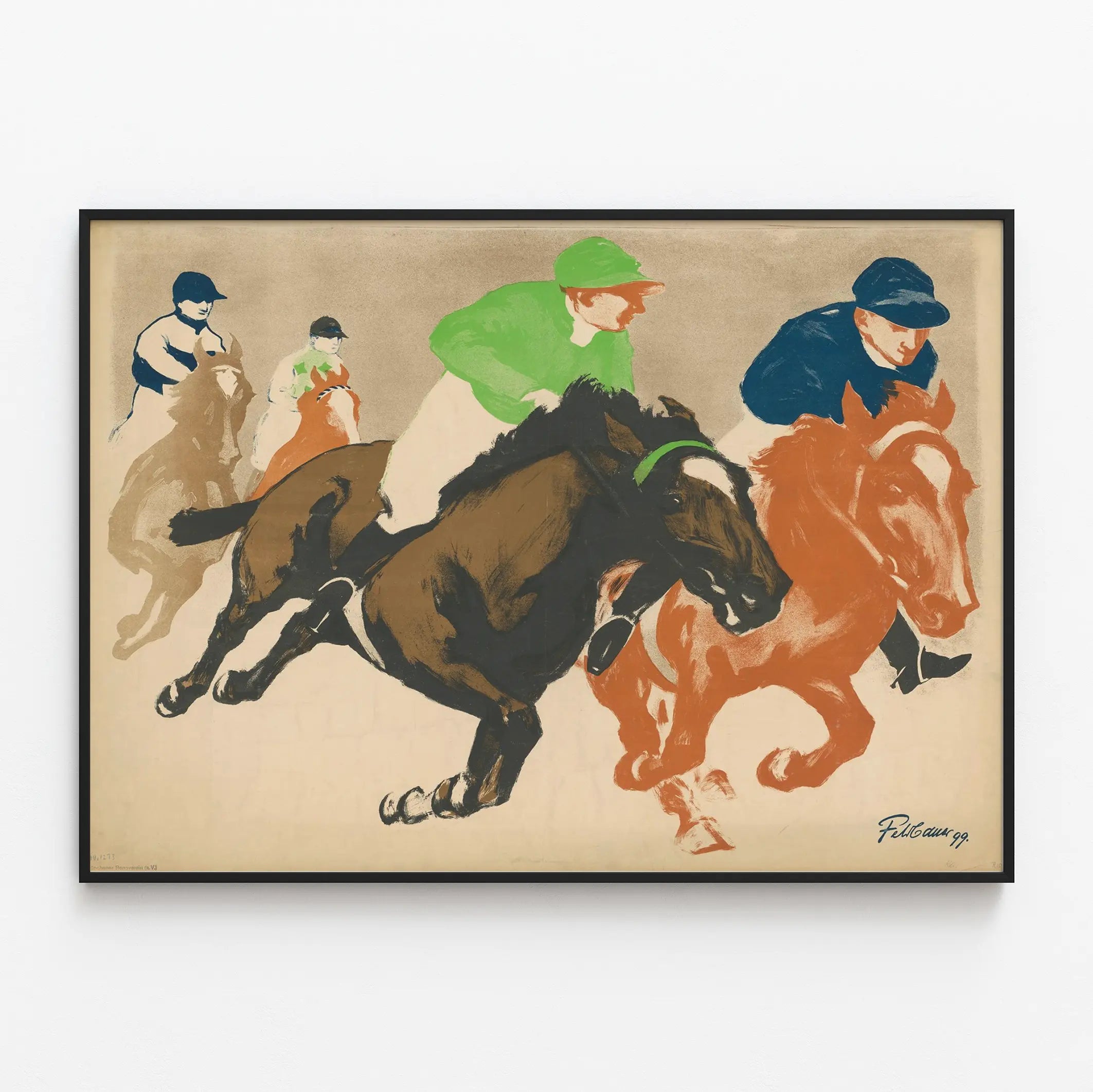 Cette affiche vintage intitulée « Fruhjahrs Rennen » capture avec dynamisme et élégance l'essence des courses hippiques. La composition se focalise sur quatre cavaliers en pleine compétition, illustrant le mouvement et la puissance des chevaux au galop. L'œuvre utilise une palette de couleurs contrastées et audacieuses, où le vert et le bleu des tenues des jockeys se démarquent sur des chevaux aux teintes chaudes de brun et d'ocre. Le fond neutre met en valeur les silhouettes en action, offrant une sensation de vitesse et de tension. Ce poster d'art mural vintage s'adresse aux amateurs d'équitation, de sports équestres et de décoration murale rétro. Parfait pour créer une atmosphère dynamique dans un salon, un bureau ou un espace dédié au sport, cette affiche apporte un style intemporel et plein de caractère. Elle s'intègre harmonieusement dans un intérieur moderne ou classique, apportant une touche esthétique tout en évoquant une ambiance sportive et festive. Ce tableau graphique, par son style épuré et ses formes expressives, constitue également un bel exemple d'affiche artistique autour du thème des courses hippiques. Il s'impose comme un choix décoratif idéal pour tous ceux qui souhaitent allier passion du sport et décoration murale originale. Son design incite à la contemplation de l'énergie et de la grâce des chevaux en compétition, renforçant ainsi l'attrait visuel de votre décoration intérieure. En somme, ce poster « Fruhjahrs Rennen » est une pièce de décoration murale qui combine art et passion pour le sport hippique. Il habille vos murs avec authenticité et style, valorisant votre espace de vie ou de travail par son esthétique vintage et ses couleurs soigneusement choisies. Un choix parfait pour les amateurs de belles affiches et les passionnés de ce sport élégant.
