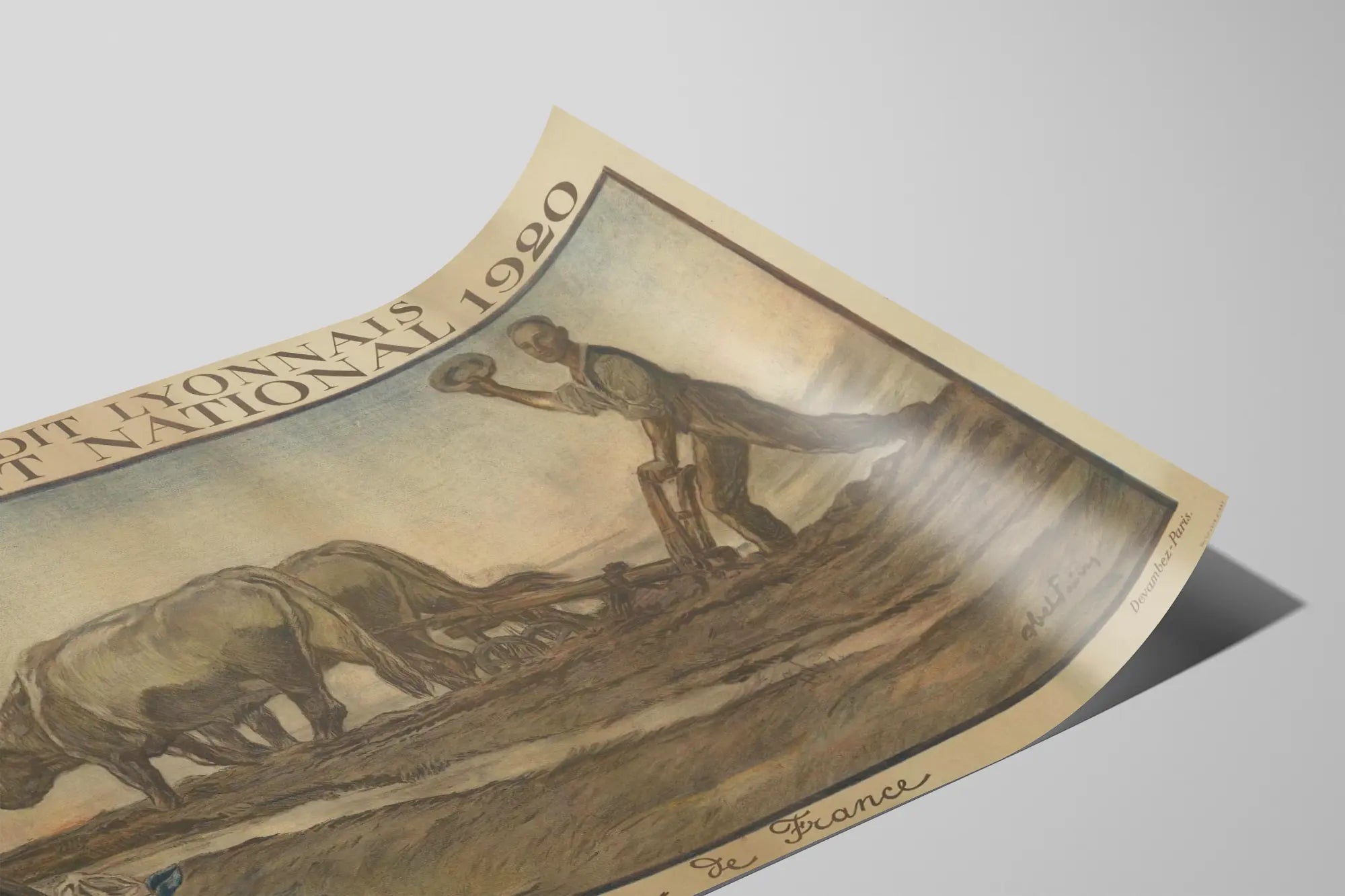 Cette affiche vintage du Crédit Lyonnais, intitulée « Emprunt National 1920 », est une pièce de décoration murale d'exception qui évoque la France rurale et le patrimoine agricole. Dans cette illustration, un homme laboure la terre à l'aide de bœufs, symbolisant la force et la détermination de la nation pour reconstruire et investir dans son avenir au lendemain de la Première Guerre mondiale. L'œuvre utilise une palette de tons chauds et naturels et met en avant l'importance du travail agricole pour le pays, soulignée par l'inscription « Terre de France » en bas de l'affiche. Cette affiche murale se présente comme un objet de décoration valorisant l'histoire économique et sociale française. Elle est idéale pour les amateurs d'art vintage, les passionnés d'histoire, ou ceux qui souhaitent intégrer une touche authentique et historique dans leur intérieur. Le graphisme est sobre et réaliste, reflétant le style artistique des années 1920, avec une attention particulière à la représentation des personnages et des animaux. Le poster, signé « Devambez-Paris », constitue une parfaite illustration de communication visuelle d'époque, ciblant les emprunts nationaux destinés à financer la reconstruction. Le cadre champêtre et la posture du laboureur qui lève son chapeau en signe d'appel à la mobilisation et au soutien financier témoignent d'une époque où l'engagement citoyen passait par ces souscriptions collectives. Parfait pour habiller un mur dans un bureau, un salon ou une bibliothèque, ce tableau mural apporte une touche d'authenticité et un lien visuel avec l'histoire rurale française. Affiche décorative par excellence, elle se distingue par son message patriotique et sa représentation réaliste du monde agricole, un sujet rarement mis en valeur dans la décoration murale. En intégrant cette affiche dans votre espace, vous optez pour une décoration murale qui mêle esthétique vintage et portée historique, idéale pour un environnement sobre et élégant. Ce poster classique s'adapte parfaitement aux intérieurs de styles traditionnels comme modernes, en apportant un point focal riche en significations et en textures, grâce à son illustration au trait délicat et son ambiance nostalgique.