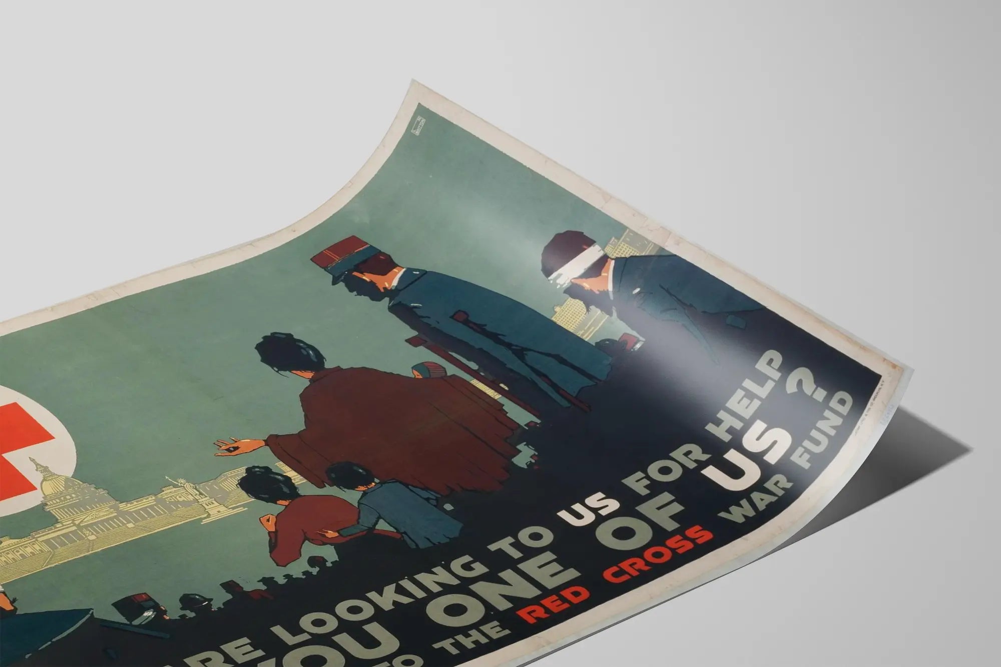 Cette affiche vintage illustre un appel puissant à la solidarité en faveur de la Croix-Rouge durant une période de guerre. Les silhouettes sombres d'hommes, de femmes et d'enfants amputés et blessés regardent vers une grande croix rouge, symbole universel de secours et d’assistance. La scène centrale montre clairement l’importance de l’entraide et du soutien aux victimes de conflits. Le fond architectural évoque une ville emblématique, renforçant le message d’urgence et d'appel à la mobilisation générale. Ce poster vintage est un exemple frappant de décoration murale à la fois riche en histoire et chargé d’émotion, idéal pour une déco d’intérieur qui souhaite combiner engagement et esthétisme. Son style graphique caractéristique des affiches de propagande humanitaire du début du XXe siècle utilise des couleurs sobres et contrastées, avec un usage stratégique du rouge pour attirer le regard vers la Croix-Rouge et le texte incitant à l’action. Cette décoration murale au style rétro se présente comme une pièce forte, capable d’apporter une touche à la fois historique et artistique à un espace personnel ou professionnel. L’affiche est parfaitement adaptée pour être encadrée et exposée dans des lieux variés comme des bureaux, des espaces associatifs ou des intérieurs modernes recherchant une ambiance engagée. En tant que poster, elle allie un message clair et symbolique à un design graphique intemporel, faisant d’elle un objet décoratif à la fois esthétique et chargé de sens. Ajouter cette affiche à votre collection de décoration murale, c’est aussi intégrer une pièce racontant une histoire de solidarité et d’humanité, évoquant le rôle crucial des organisations humanitaires pendant les conflits mondiaux.
