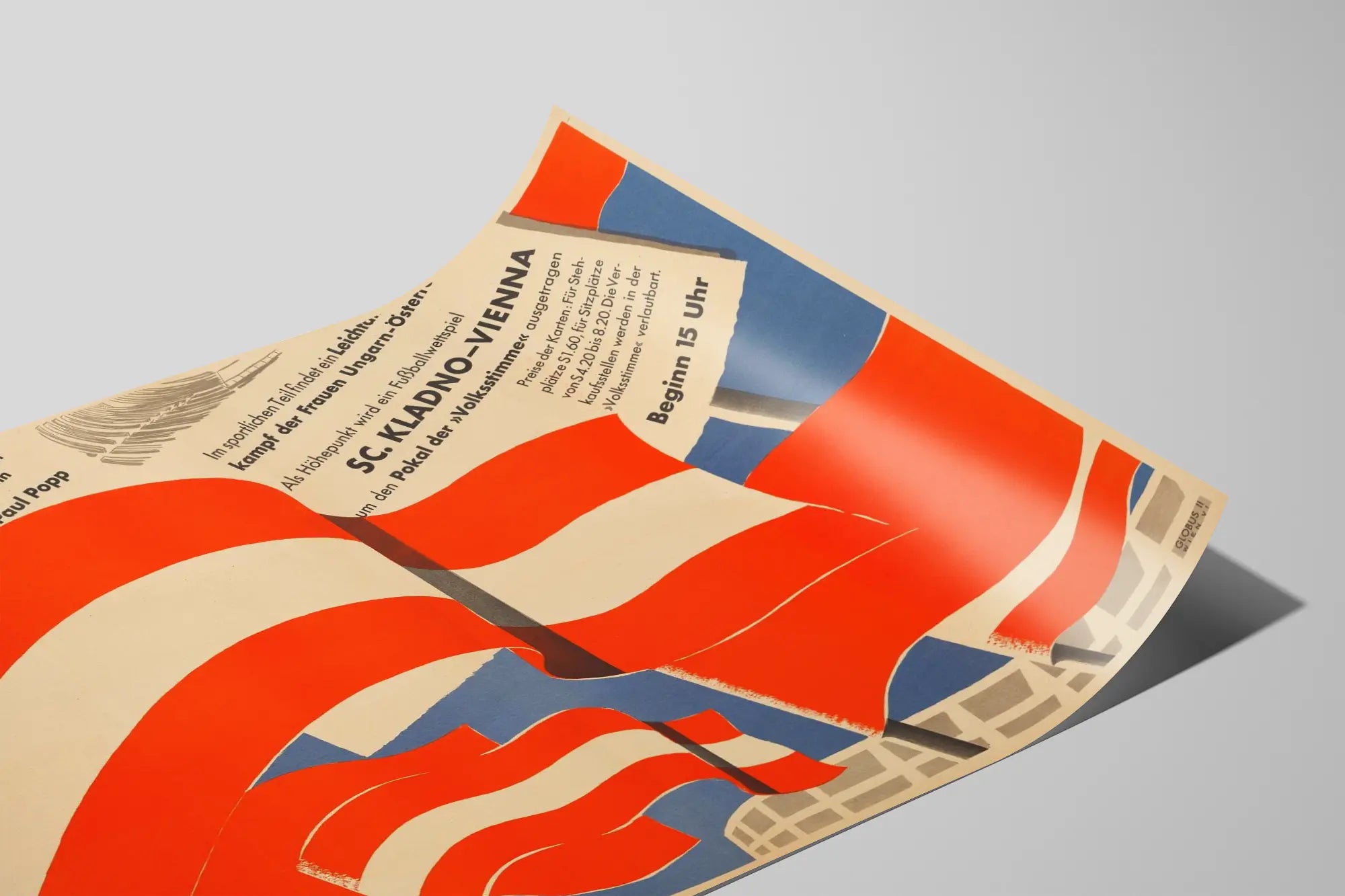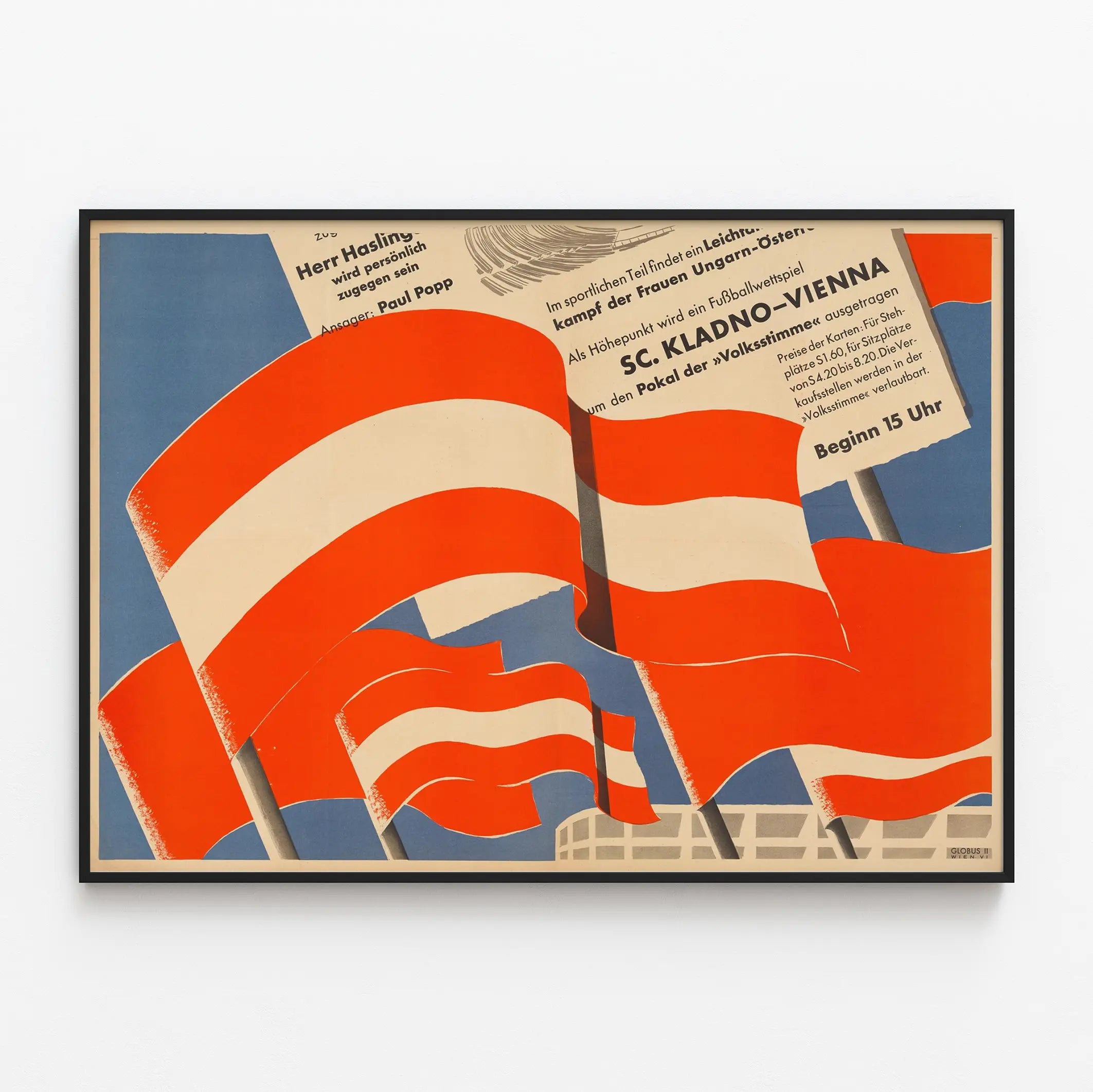 Cette affiche vintage de décoration murale célèbre le premier anniversaire du Volksstimmefest, un événement organisé en Autriche en 1946. L'affiche met en avant de grands drapeaux rouges et blancs flottants sur un ciel bleu, symbolisant l'esprit de fête et d'unité. Dessinée dans un style graphique et épuré avec une palette limitée de couleurs, elle capture une ambiance rétro typique des années d'après-guerre. Le texte présenté sur l'affiche annonce plusieurs activités, notamment un match de football entre SC Kladno et une équipe viennoise, ainsi qu'un combat sportif mettant en scène des femmes d'Europe centrale. Le graphisme dynamique et la mise en page originale de cette affiche en font un objet de décoration murale idéal pour les amateurs d'art graphique et d'histoire. En affichant ce poster, vous apportez à votre intérieur une touche vintage authentique, combinant aspects culturels et visuels forts. Cette pièce est parfaite pour décorer votre salon, bureau ou espace dédié à la collection d'affiches historiques ou de répliques de posters anciens.