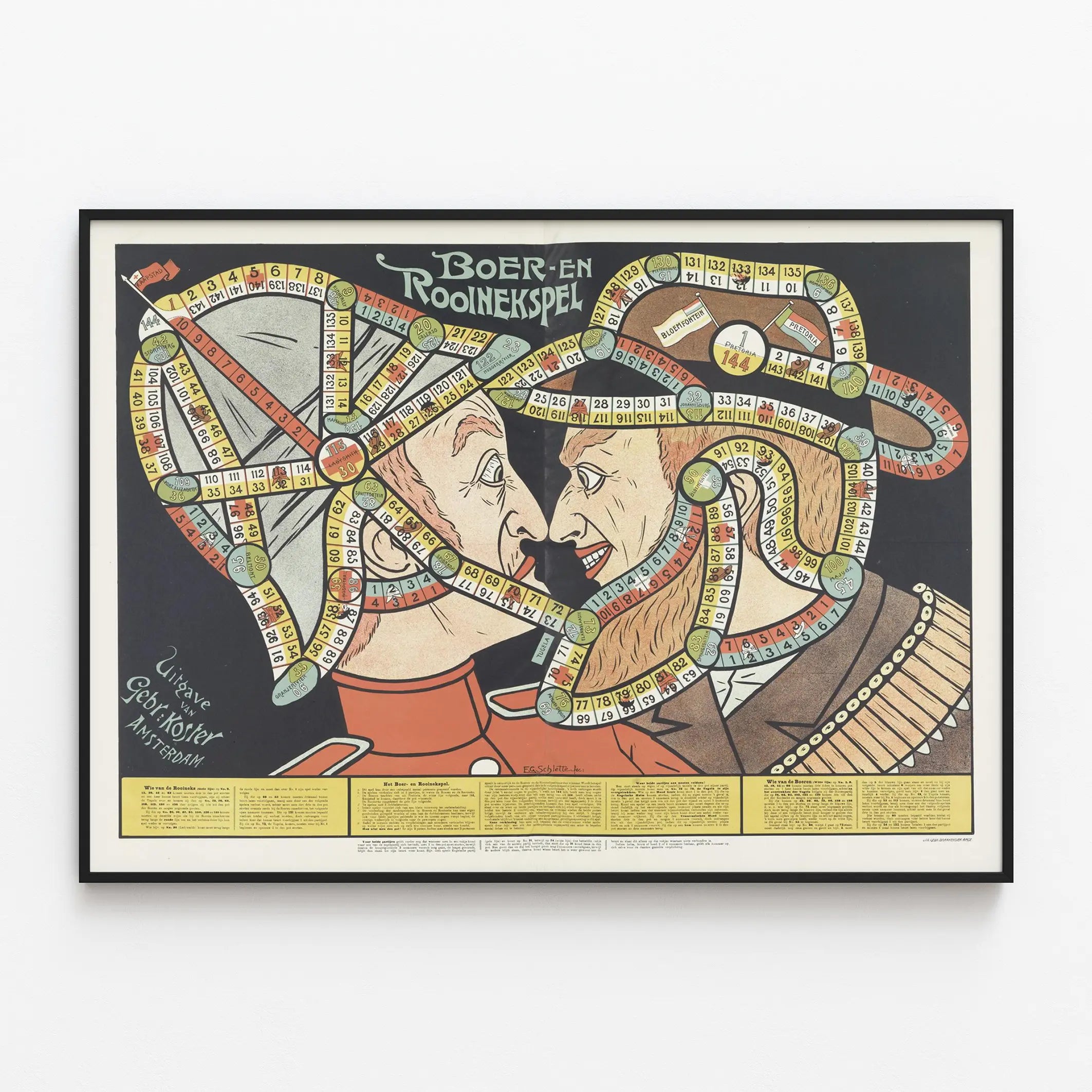 Cette affiche vintage représente un jeu de société intitulé "Boer en Rooiniekspel", un véritable élément de décoration murale qui invite au voyage dans le temps. L'affiche présente deux portraits stylisés se faisant face, l'un à gauche portant un chapeau militaire et l'autre à droite avec une barbe fournie, tous deux entourés d'un parcours de jeu en spirale composé de cases numérotées de différentes couleurs (jaune, rouge, bleu et vert). Chaque case semble indiquer une étape ou un événement lié au jeu, avec quelques symboles et petits dessins en lien avec le thème. Ce poster offre un mélange unique d'illustration graphique et de ludisme qui s'intègre parfaitement dans un espace dédié à la décoration murale originale et historique. L'aspect graphique soigné et les couleurs douces contribuent à créer une ambiance rétro et un effet vintage très marqué, idéal pour enrichir un intérieur avec une touche d'authenticité et d'histoire. Ce type d'affiche peut particulièrement séduire les amateurs de jeux anciens, de culture populaire ou encore de pièces décoratives à forte valeur visuelle. L'inscription en néerlandais ajoute un charme international supplémentaire à cette pièce, rendant l'affiche originale pour une décoration murale thématique ou collection. Le poster est également un excellent choix pour ceux qui souhaitent ajouter un élément narratif à leur décoration, combinant esthétique artistique et passion pour les jeux de société traditionnels. Que ce soit dans un salon, une bibliothèque ou une salle de jeux, cette affiche saura capter le regard et susciter la curiosité grâce à son design unique et son univers graphique riche en détails. En somme, cette décoration murale est une invitation à la convivialité et à la redécouverte des jeux classiques à travers une œuvre visuelle authentique.