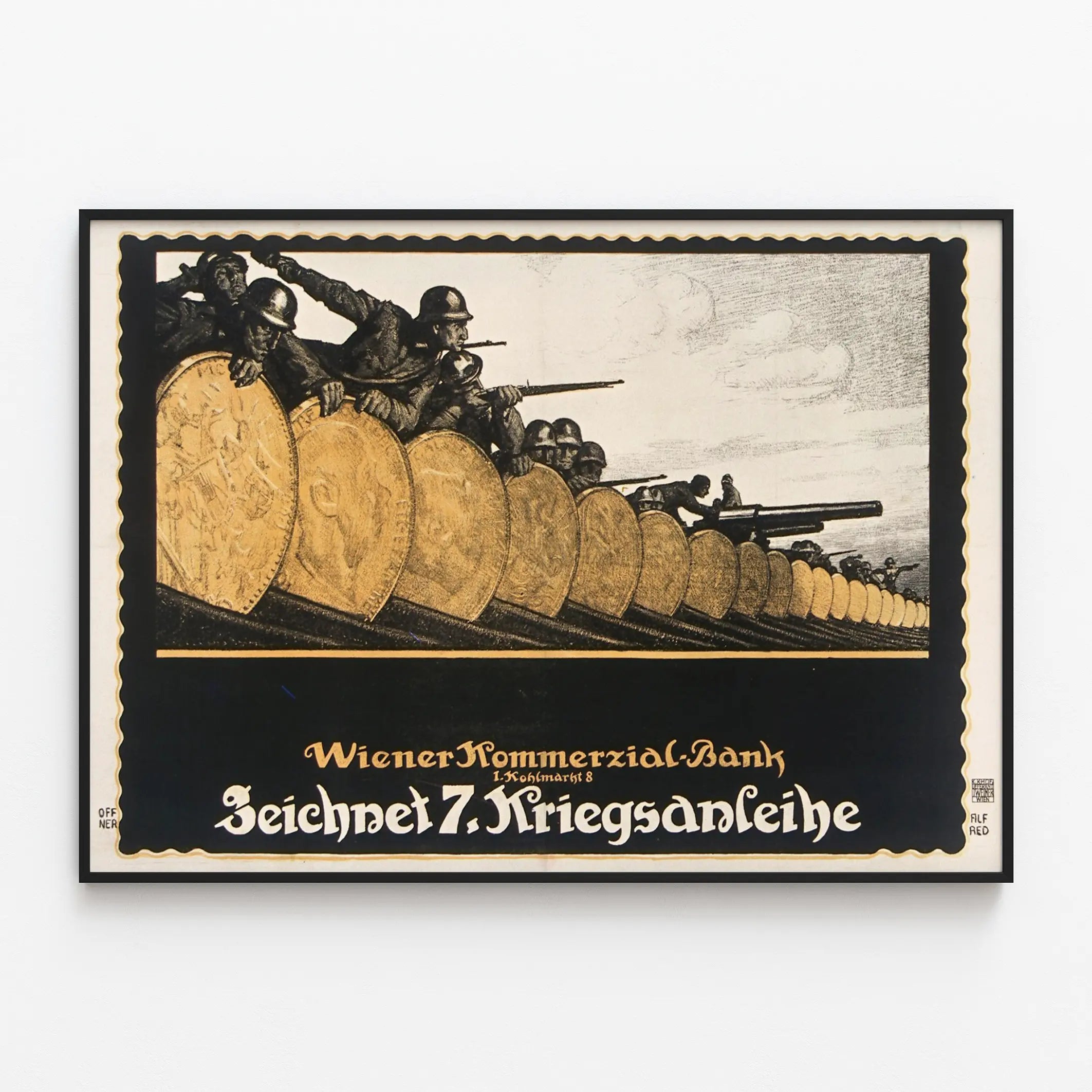 Cette affiche vintage de la Wiener Kommerzial Bank est une pièce unique de décoration murale historique. Elle illustre la force et la détermination à travers une ligne de soldats en armure et casques, qui utilisent des pièces de monnaie géantes comme boucliers, symbolisant l'engagement financier dans la guerre. Ce poster met en avant un design graphique fort, avec une palette de couleurs dominée par des tons dorés et noirs, apportant une esthétique à la fois ancienne et puissante. Cette affiche convient parfaitement à une décoration murale d'ambiance historique ou militaire, idéale pour les amateurs d'art graphique et d'histoire. Elle peut aussi s'intégrer dans un intérieur à thème vintage ou industriel, renforçant une atmosphère authentique et marquante. Ce tableau mural au style ancien et détaillé est une invitation à la réflexion, révélant le lien entre finance et conflit, tout en décorant avec caractère et originalité. Son format et ses détails en font un poster attractif pour un espace d'exposition ou un salon, mêlant art et histoire. Ajouter cette décoration murale à votre collection apportera une dimension culturelle et esthétique significative.