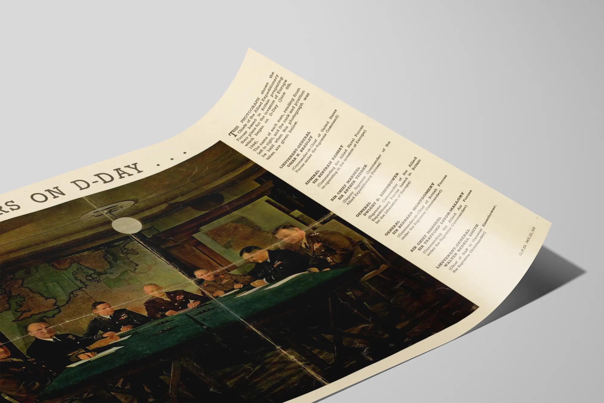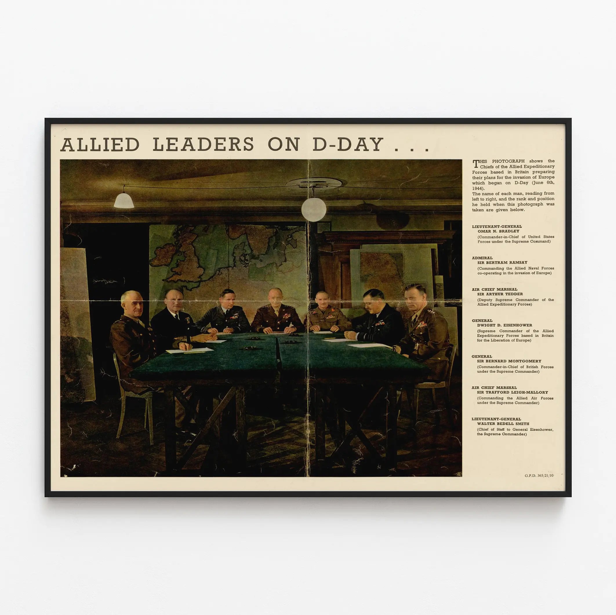 Cette affiche vintage emblématique représente une photographie historique des chefs des Forces expéditionnaires alliées basées en Grande-Bretagne, durant la préparation du débarquement du D-Day, daté du 6 juin 1944. Cette décoration murale met en scène une réunion stratégique entre plusieurs figures militaires clés, au moment décisif de la planification de l'invasion de l'Europe pendant la Seconde Guerre mondiale. Sur un fond de cartes géographiques, les leaders militaires sont regroupés autour d'une grande table verte, évoquant l'ambiance d'une salle de commandement militaire. Ce poster reprend fidèlement l'esthétique des documents d'époque, avec l'incription « ALLIED LEADERS ON D-DAY… » en haut et une description détaillée à droite listant les noms et fonctions des officiers présents. Parmi eux, on reconnaît le lieutenant-général Omar N. Bradley, l'amiral Sir Bertram Ramsay, l'air chief marshal Sir Arthur Tedder, le général Dwight D. Eisenhower, le général Sir Bernard Montgomery, l'air chief marshal Sir Trafford Leigh-Mallory et le lieutenant-général Walter Bedell Smith. Cette affiche est idéale pour une décoration murale qui souhaite allier histoire, patrimoine et authenticité. Elle apportera une dimension historique captivante à tout espace, qu'il s'agisse d'un bureau, d'un salon ou d'une bibliothèque. En format poster, ce visuel séduit les amateurs de décoration murale vintage et les passionnés d'histoire militaire, offrant une pièce unique qui illustre un moment clé du XXe siècle. Son style rétro, ses couleurs légèrement vieillies, et son aspect texturé ajoutent une touche d'authenticité et de charme à cette œuvre décorative. Ce type de tableau historique devient un élément central dans une ambiance classique ou industrielle, mettant en valeur un passé marquant sans oublier l'esthétique et la qualité visuelle. Que ce soit pour une collection de posters historiques ou pour un intérieur empreint de sens, cette affiche « Allied Leaders on D-Day » est une pièce décorative incontournable.