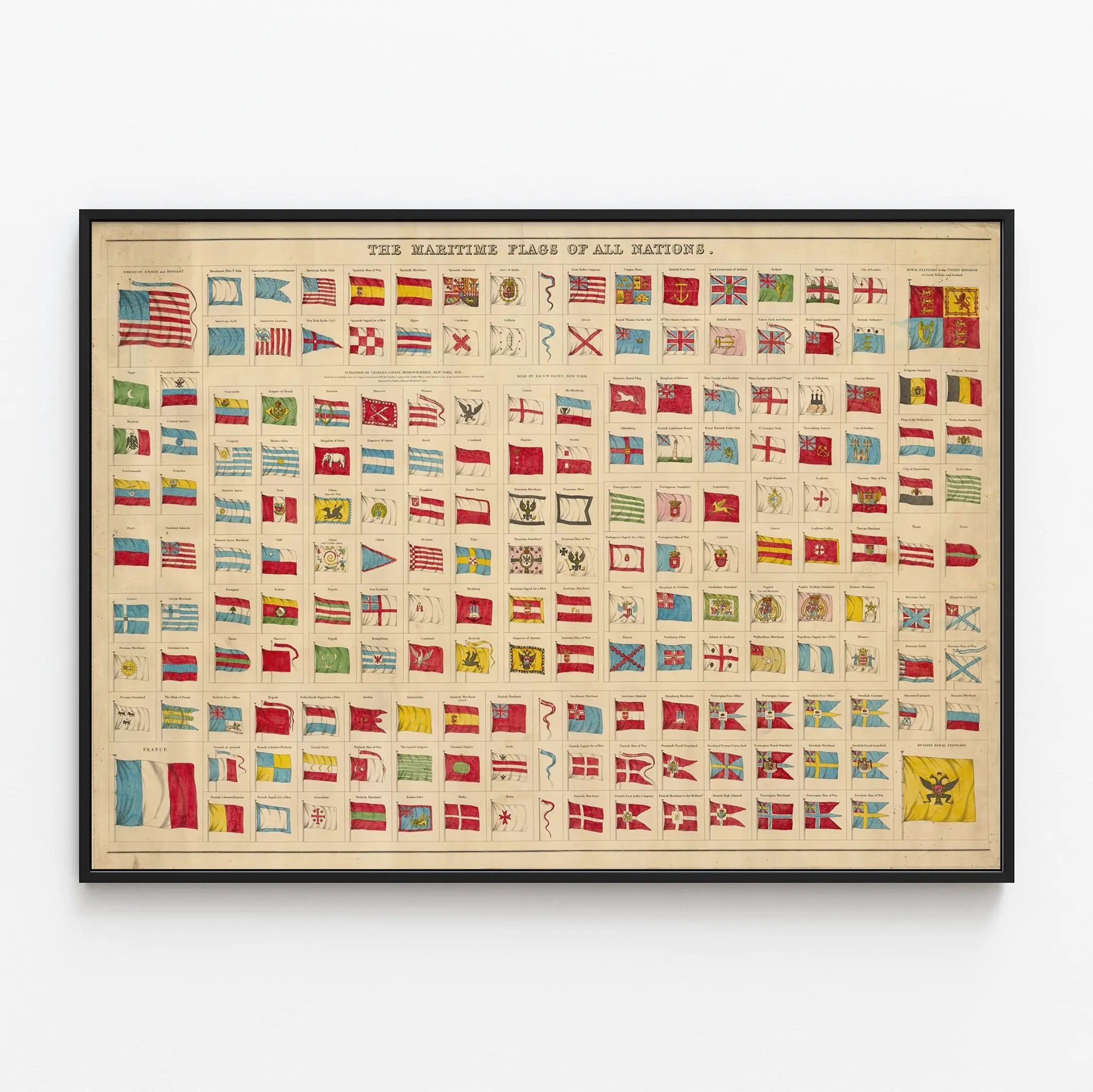 Cette affiche vintage représente une collection complète et détaillée des pavillons maritimes utilisés par de nombreuses nations à travers le monde. Conçue comme une décoration murale, cette pièce est idéale pour les passionnés d'histoire maritime, de navigation ou pour ceux qui souhaitent apporter une touche unique et originale à leur intérieur. L'affiche montre avec précision une grande variété de drapeaux, classés par pays et par usage, incluant les pavillons de guerre, marchands, de yacht, ainsi que les signaux et les enseignes spécifiques à chaque nation. Chaque pavillon est illustré en couleurs, avec une finesse graphique qui rappelle les anciennes planches d'imprimerie du XIXe siècle. Cette décoration murale est parfaite pour un bureau, un salon ou une bibliothèque, apportant un charme authentique et un esprit d'aventure et de découverte. Le poster met en avant des drapeaux de plusieurs continents et époques, révélant une richesse culturelle et historique à travers les symboles nautiques. Cette affiche maritime s'intègre parfaitement à une décoration murale de style vintage, nautique ou historique. Elle permet aussi d'éduquer et de captiver l'imagination grâce à sa diversité visuelle, étant un outil décoratif et thématique à la fois. Sur un support papier de qualité, ce tableau mural est une pièce décorative qui combine esthétique et savoir, idéale pour les amateurs d'affiches thématiques. Que ce soit pour une décoration d'intérieur d'inspiration marine ou pour compléter une collection d'objets liés à la mer, ce poster des pavillons maritimes est un choix remarquable. Il offre une belle diversité de couleurs et de formes, pouvant aussi servir de base à une ambiance décorative évoquant les voyages et l'exploration maritime.