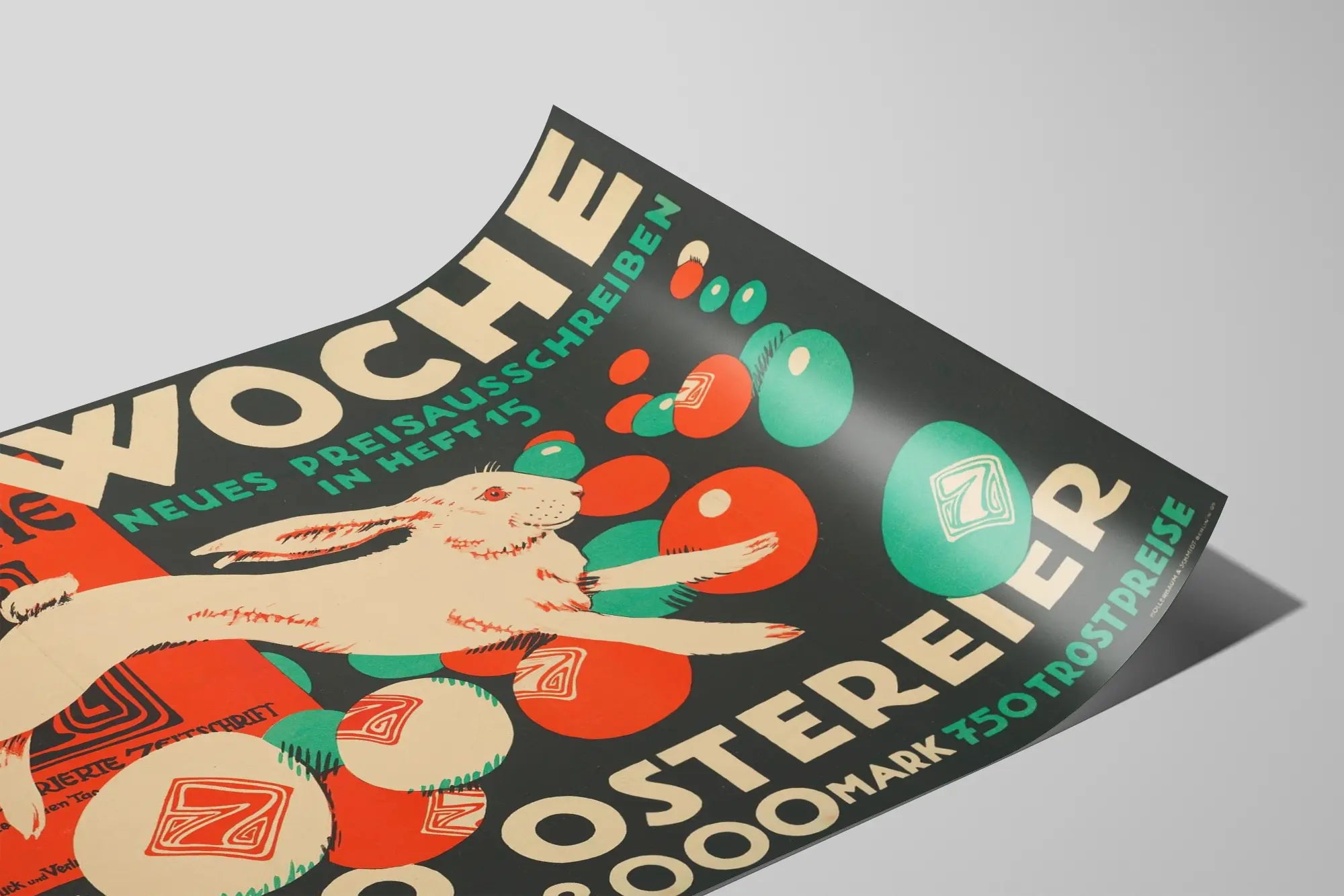 Découvrez cette affiche vintage intitulée « Die Woche » mettant en scène un lapin blanc sautant parmi des œufs de Pâques colorés dans des teintes rouge vif, vert turquoise et beige. Ce poster publicitaire rétro évoque un concours organisé, mettant en avant 1000 œufs de Pâques ainsi que des prix en argent totalisant 3000 marks. Parfait pour les passionnés d'art graphique et de décoration murale au style rétro, ce tableau apporte une touche à la fois ludique et colorée à votre intérieur. Avec son design original et ses couleurs contrastées, cette illustration est idéale pour égayer tout espace, notamment lors des périodes printanières ou pour célébrer Pâques. Cette affiche vintage peut être accrochée dans un salon, une chambre ou un bureau, offrant une décoration murale unique qui rappelle les anciennes campagnes publicitaires européennes. Son style graphique simple et ses couleurs marquées conviendront aussi bien aux amateurs de décoration moderne qu'aux collectionneurs d'affiches anciennes. L'association du lapin de Pâques et des œufs crée une ambiance festive et dynamique, tandis que le texte en allemand confère un charme authentique à cette pièce décorative. Ce poster est une invitation à la découverte d'une époque révolue à travers un graphisme qui reste intemporel, parfait pour personnaliser vos murs avec caractère et originalité.