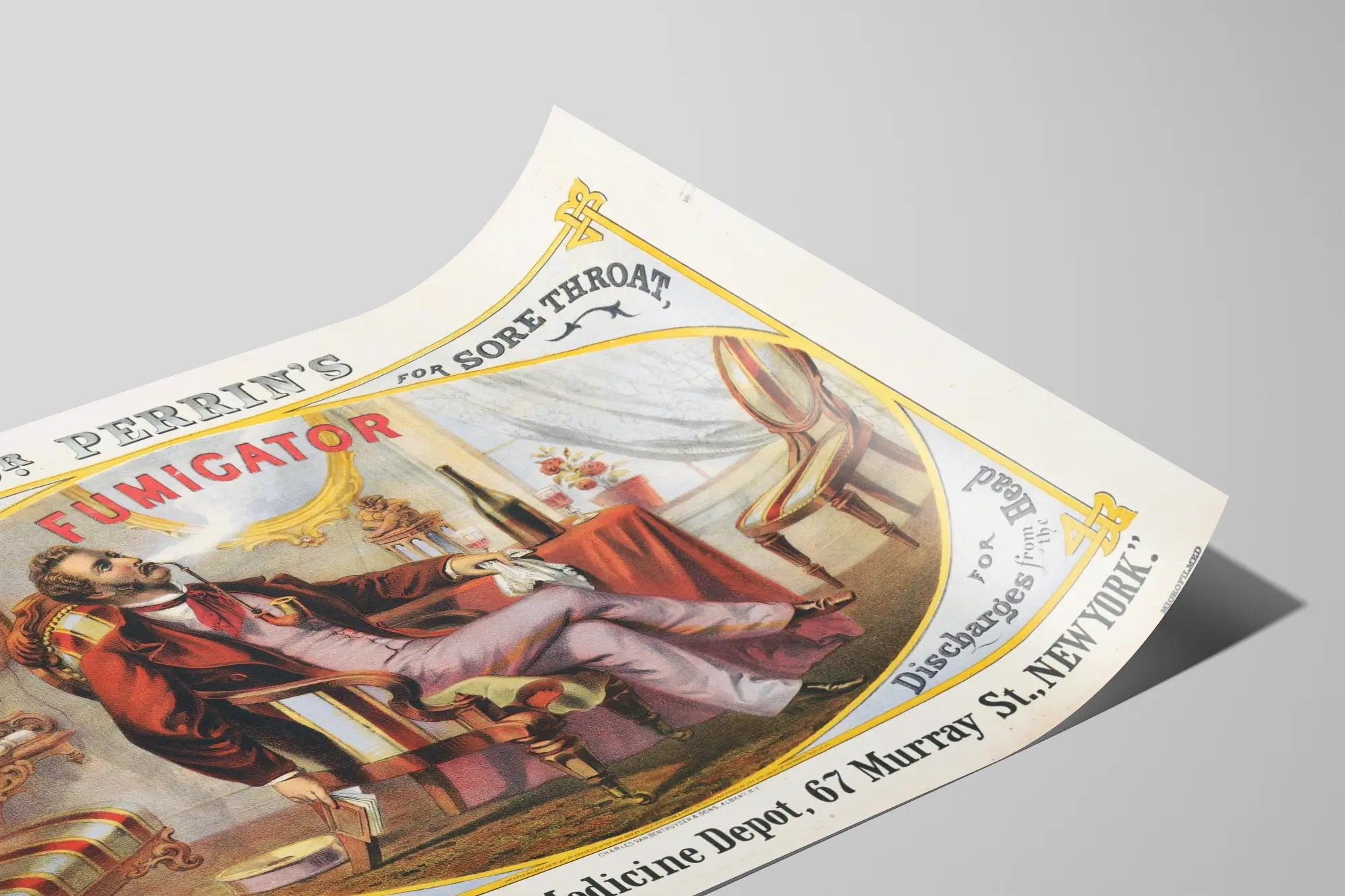 Cette affiche vintage illustre la publicité pour le "Fumigator" du Dr. Perrin, un produit ancien destiné à soulager plusieurs maux liés aux voies respiratoires supérieures. Représentant une scène intérieure élégante du XIXe siècle, elle montre un homme assis confortablement dans un fauteuil, utilisant un fumigateur pour traiter des affections telles que le catarrhe, le mal de gorge, la perte de la voix et les écoulements nasaux. Ce poster, riche en détails, met en avant les vertus médicinales supposées de l'appareil, comme indiqué en grandes lettres rouges au centre, et entouré de textes explicatifs en anglais."Décorative et informative, cette affiche constitue une décoration murale originale à la fois pour les amateurs d'art publicitaire vintage et pour ceux qui apprécient les ambiances d'époque. La qualité de l'illustration fait ressortir les nuances de couleurs des vêtements, du mobilier classique et du fumigateur en action. Une table couverte d'une nappe rouge, des verres et un bouquet de fleurs ajoutent une touche d'intimité à la scène. Placée dans un cadre adéquat, cette affiche vintage sera un élément attractif pour une décoration murale dans un intérieur au style rétro ou dans une collection sur le thème de la médecine ancienne. Elle évoque à la fois l'histoire des remèdes populaires et le charme graphique des affiches publicitaires d'autrefois.