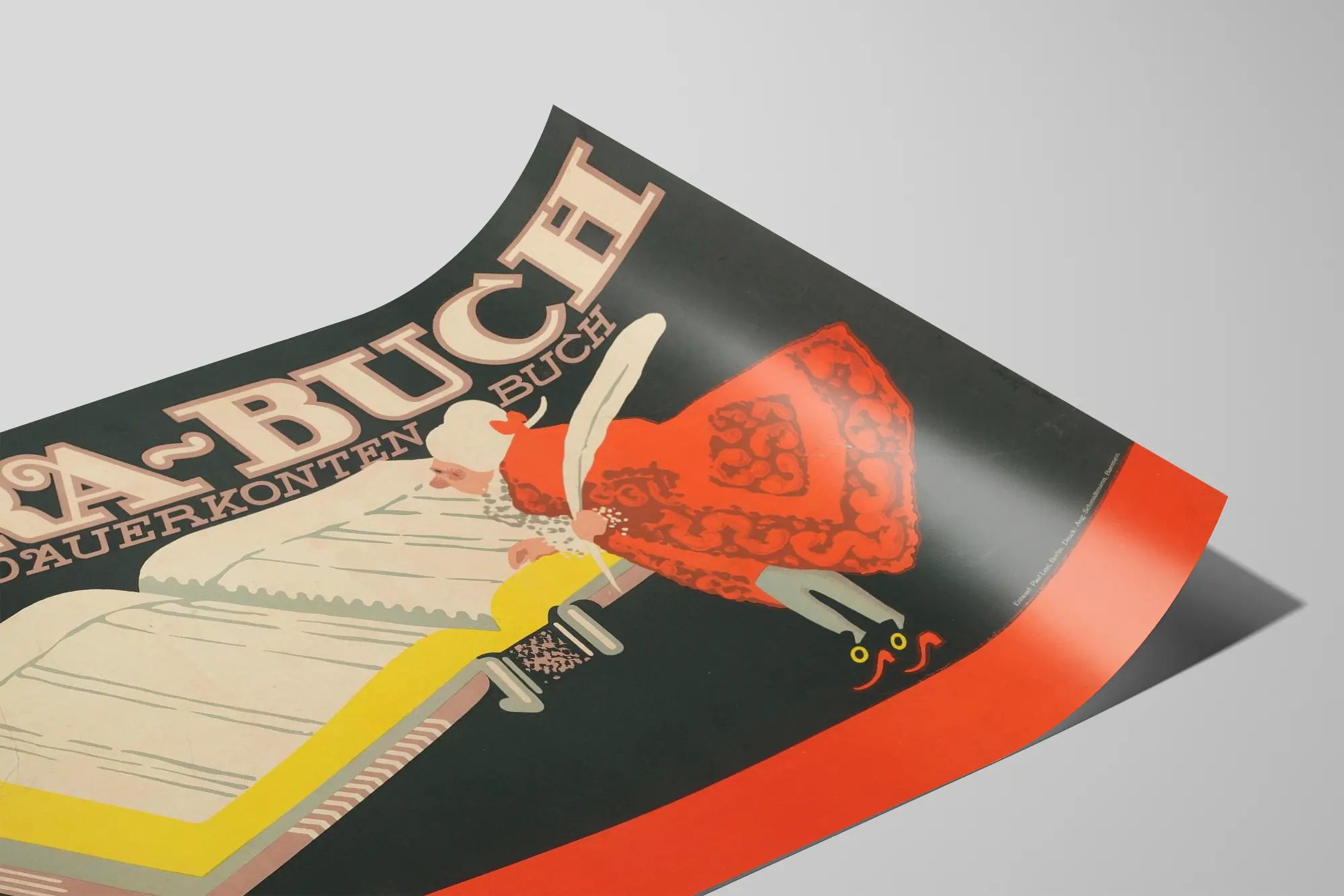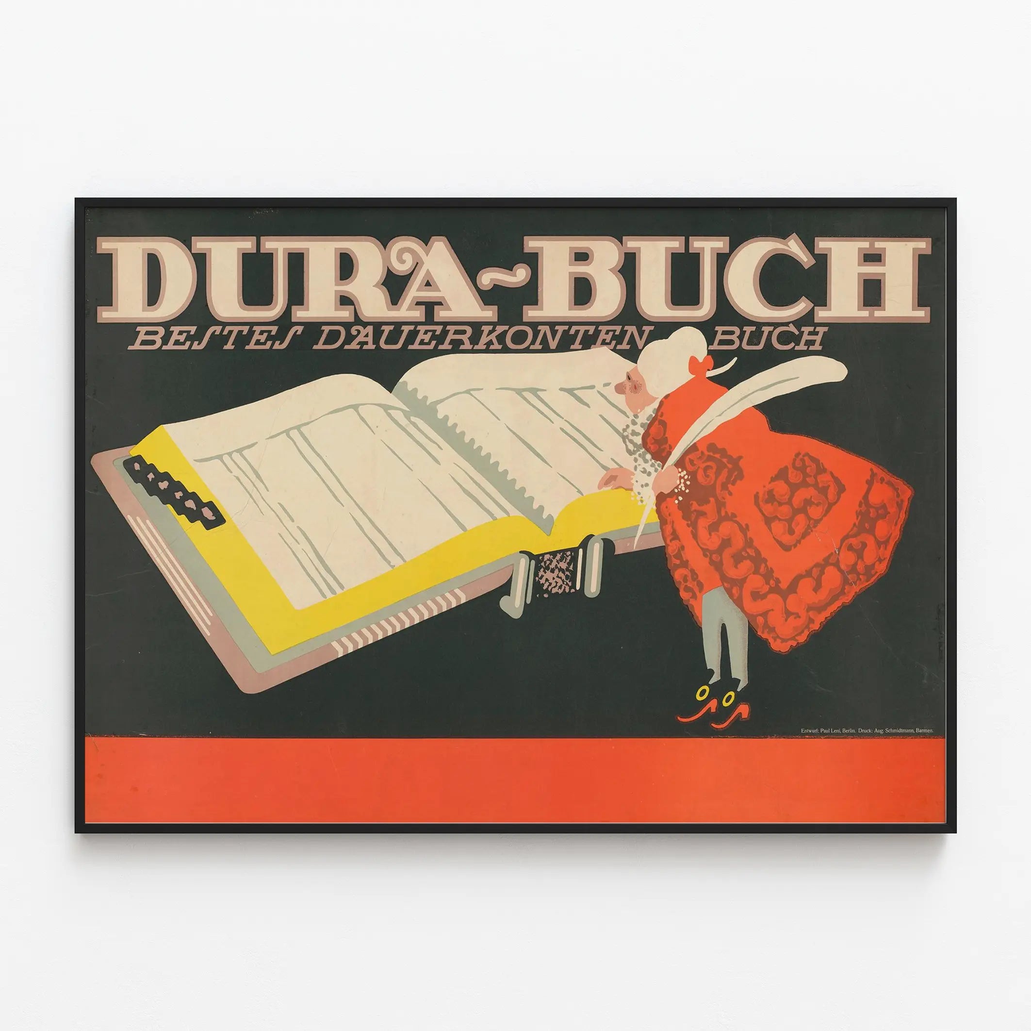 Cette affiche vintage DURA-BUCH est une décoration murale originale qui met en avant un livre ouvert de comptabilité permanente, intitulé "Bestes Dauerkonten Buch". Son style graphique rétro, marqué par des couleurs sobres et un dessin stylisé, apporte une touche authentique et intemporelle à votre intérieur. Le personnage illustré, vêtu d'une tenue ancienne et tenant une plume blanche, semble concentré sur l'écriture dans ce grand livre, soulignant ainsi le thème du travail et de la rigueur administrative. Cette affiche, avec ses typographies audacieuses et son dessin épuré, est parfaite pour embellir un bureau, une bibliothèque ou une salle d'étude en leur conférant une ambiance à la fois professionnelle et artistique. En forme de poster mural, cette pièce unique joue avec les contrastes entre les tons sombres du fond et les teintes vives du costume du personnage et de la reliure du livre. Que vous soyez amateur de décoration vintage ou à la recherche d'un élément distinctif pour vos murs, ce tableau affiche une illustration graphique et dynamique qui capte l'attention. La qualité de cette affiche murale en fait un choix idéal pour les passionnés d'objets retro et pour tous ceux qui souhaitent apporter une note de culture et d'histoire visuelle à leur décoration intérieure.
